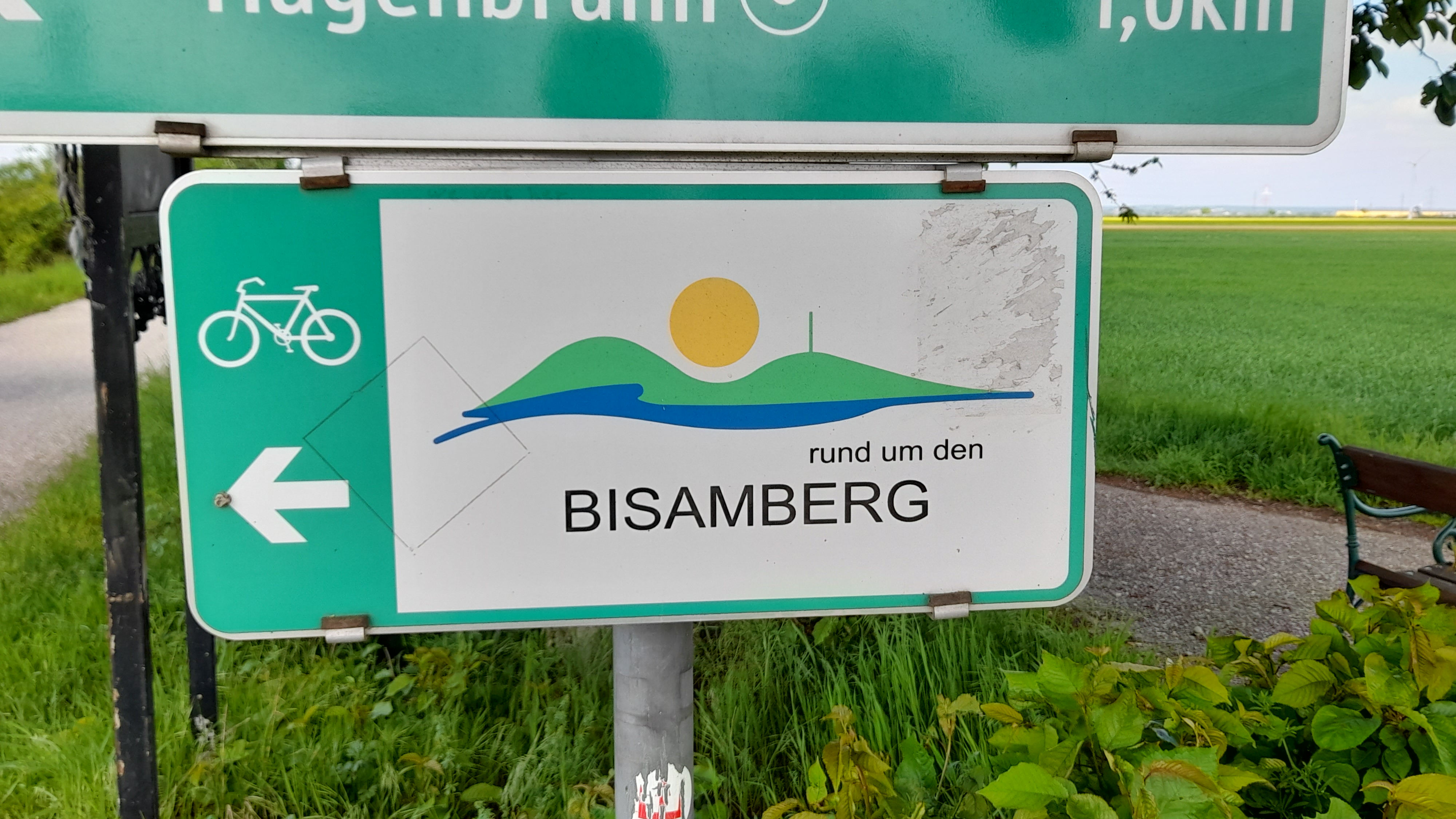 La boucle est balisée mais certains panneaux semblent parfois manquer et d’autres ont perdu de leur éclat. On les reconnaît toutefois bien par leur taille assez importante, l’inscription « Rund um den Bisamberg » et le soleil bien jaune surmontant deux collines vertes qui en est le symbole. Il arrive d’ailleurs qu’on ne voit plus que le rond jaune figurant le soleil.