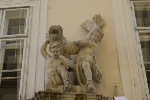 Une créature fantastique avec des ailes, semblant être celles d’un aigle, et un corps de lion, c’est un griffon ! Oui, mais il a des sabots et une tête plus proche de la chèvre que de l’aigle. Il nous fait donc penser à une chimère. L’avantage de la chimère, c’est que ses caractéristiques ne sont pas strictement codées. Elle peut avoir des ailes ou non. Dans tous les cas elle reste malfaisante. On remarque d’ailleurs qu’elle a la bouche ouverte et que les putti sont apeurés. Peut-être vient-elle de cracher du feu (son côté dragon). Toutefois dans la mythologie grecque, la chimère est bien une créature féminine, on la voit d’ailleurs souvent avec des mamelles pendantes. Nous serions donc là face à un mélange de monstres qui nous montre ouvertement son sexe, très proche de celui de l’homme ? Il pourrait donc aussi s’agir d’un satire, mais ce dernier n’a pas d’aile. Nous avons donc là un griffon à tête et sabot de chèvre. Pourquoi un griffon représenté ainsi ? J’ai cherché dans plusieurs livres et sur la toile. J’ai demandé à des gens qui vivent sur place. Résultat : Aucune explication ! Je vous propose donc quelques élucubrations qui pourraient presque avoir du sens.