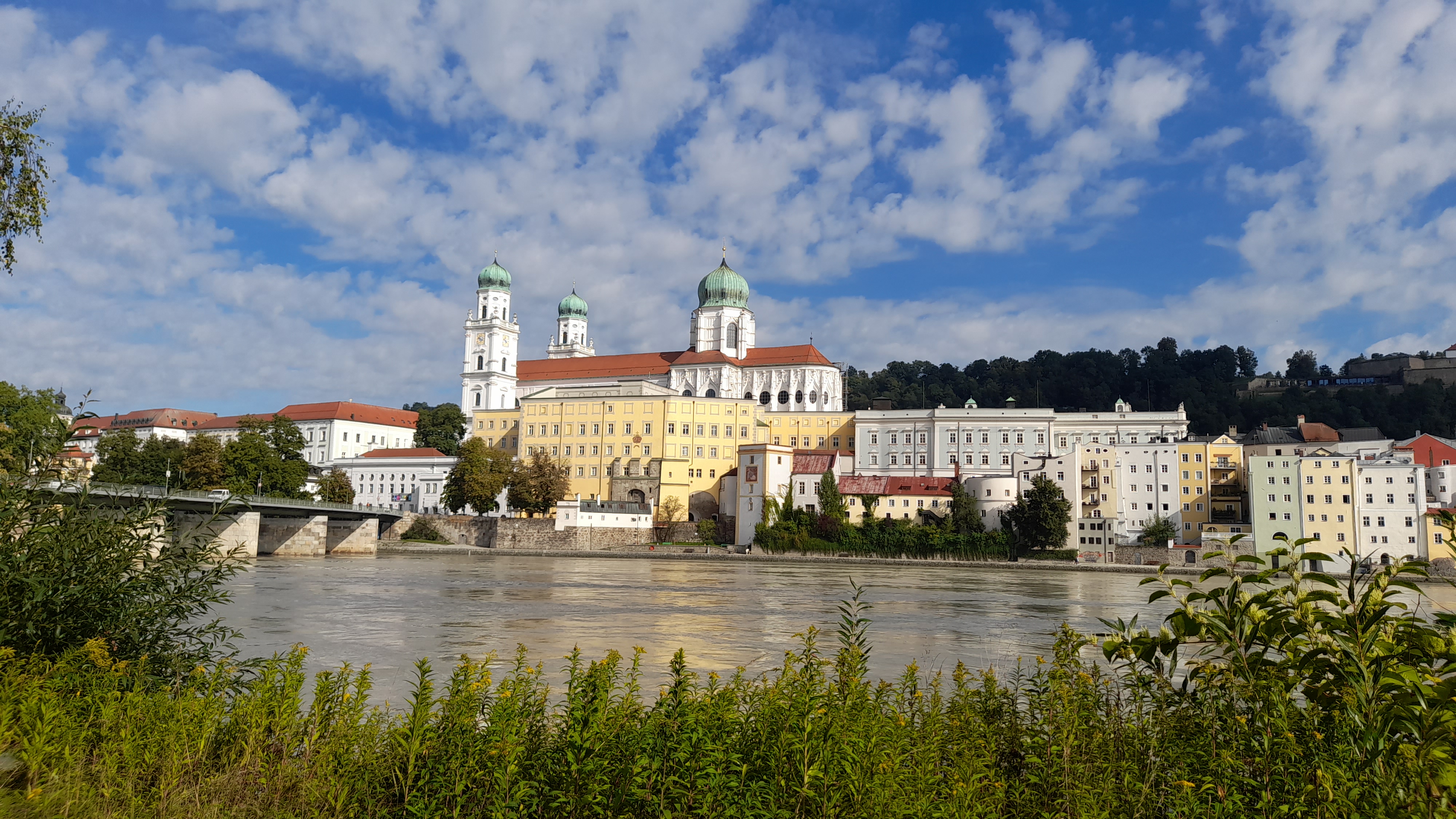 PASSAU : À Passau, si vous logez aussi dans le centre, faites un détour par le confluent de l’Inn, du Danube et de l’Ilz. On ne peut y approcher qu’à pied, mais on peut avoir son vélo à côté de soi ou le laisser quelque part. Ici mon guide pour découvrir Passau. En partant du centre de Passau pour rejoindre la rive droite du Danube, on traverse l’Inn et on bénéficie d’un très beau point de vue sur la ville.