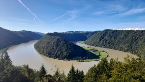 SCHLÖGEN (43e km) : À l’entrée de Schlögen, on retrouve un hangar abritant des découvertes de l’époque romaine, cette fois-ci des thermes, qui valent eux-aussi une petite halte. Schlögen, c’est vraiment le point d’orgue de cet itinéraire et l’un des plus beaux endroits du Danube. Le Danube échoue ici face à un bloc de granit qui lui fait prendre un virage à 180° et forme ainsi une vraie merveille, la boucle du Danube (Schlögener Schlinge). Pour en profiter, il faut prendre un peu de hauteur. Laissez les vélos et suivez les panneaux de randonnée indiquant « Schlögener Blick 30 min. » situés en face du grand hôtel. Il faut en effet près d’une demi-heure pour arriver au point de vue. Ça grimpe, mais la vue est époustouflante. Si jamais vous trouviez l’ascension trop difficile, lancez vous quand même, une petite clairière à mi-parcours offre déjà un bel aperçu sur cette merveille de la nature. Pour l’aller-retour, compter ¾ d’heure à une heure de marche pour les quelques 3 kilomètres à parcourir. À Schlögen, on peut prendre un bac pour l’autre rive, mais sachez que c’est un cul-de-sac, sauf si vous souhaitez rentrer à Passau par la rive gauche et faire ainsi une belle boucle à vélo.