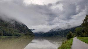 Sur près de 20 kilomètres, on continue à rouler dans cette vallée étroite et verdoyante qui semble magique, surtout avec la brume matinale. On ne traverse pas de village sur plusieurs kilomètres. Avant le premier bourg, on peut toutefois emprunté un bac pour l’autre rive à deux reprises, au 5e kilomètre au lieu-dit Kobling pour se rendre à Obermühl, et au 17e kilomètre au lieu-dit Kaiserau pour se rendre à Untermühl.