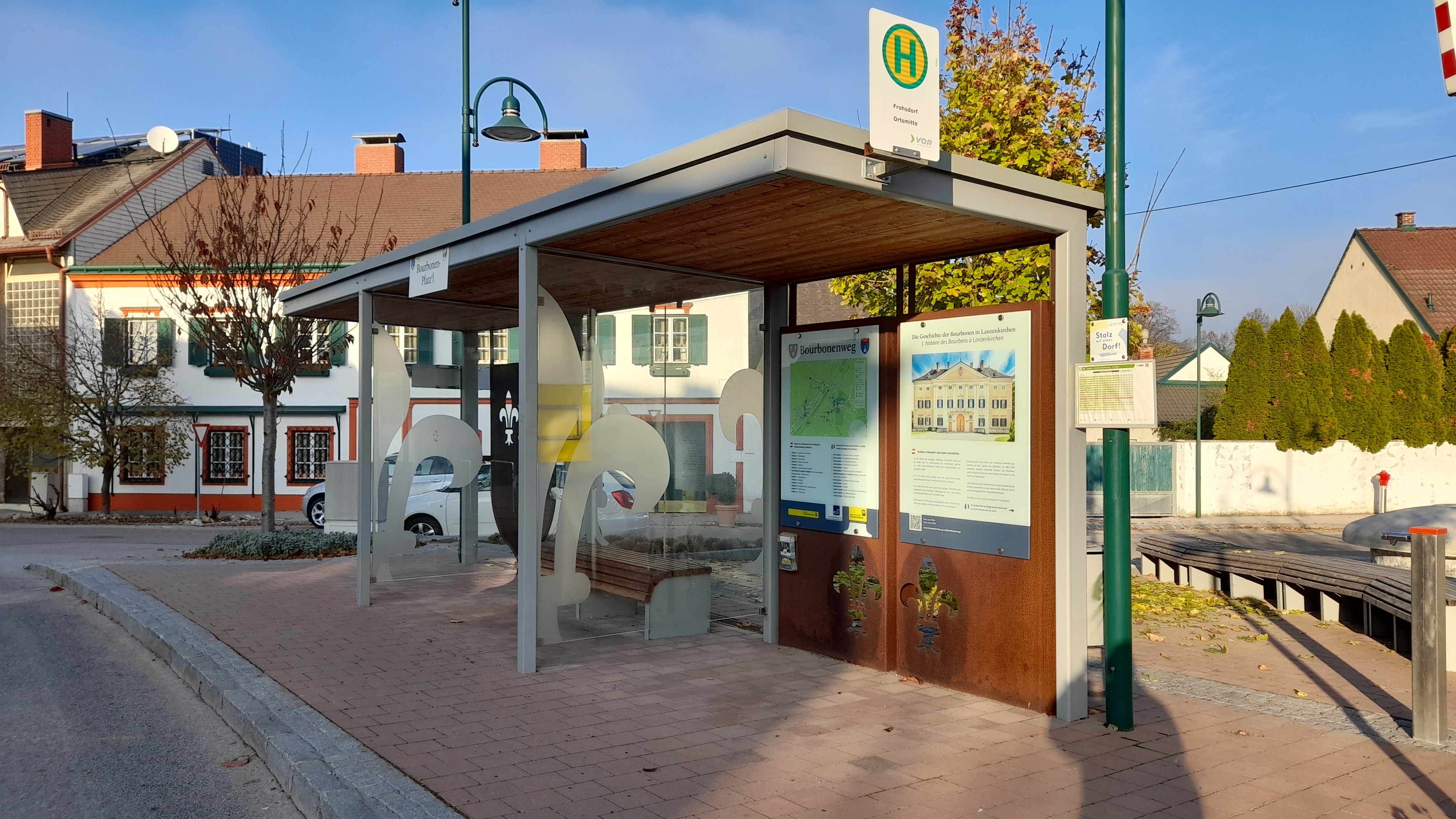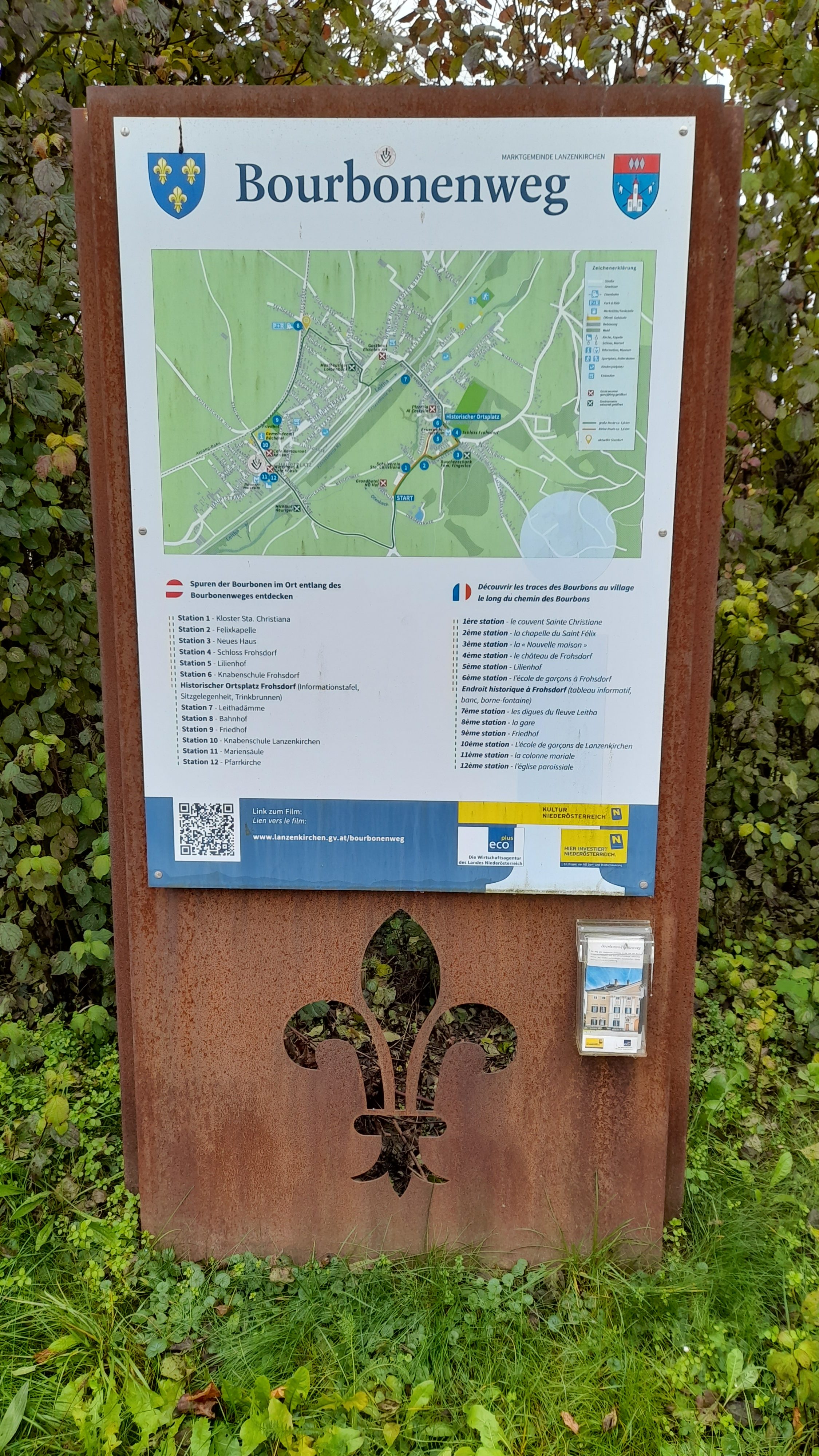 En arrivant à Lanzenkirchen, on est surpris de voir un certain nombre de fleurs de lys, notamment sur le mobilier urbain. La commune souhaite en effet mettre en valeur le passage des Bourbon sur ses terres. Pour cela, on trouve sur place un parcours très tranquille d’environ 4,5 kilomètres qui est jalonné de panneaux informant sur ses augustes habitants en allemand et en français ! On peut commencer cette boucle à la gare de Lanzenkirchen ou à l’arrêt de bus de Frohsdorf (Ortsmitte), rebaptisé Bourbonen-Platz’l, où se trouve à chaque fois un grand panneau avec un plan du parcours et des dépliants. Le parcours n’est pas balisé, mais il est très simple à suivre. Il est presque impossible de se tromper.