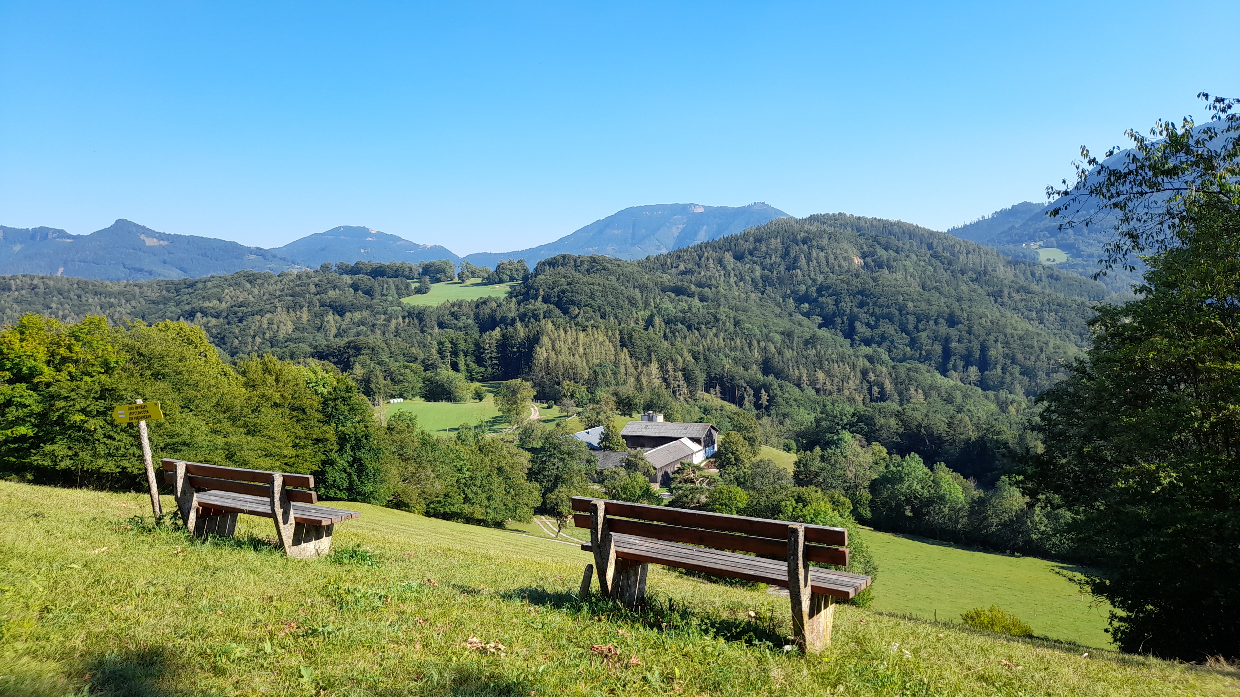 Pour la boucle, continuez sur le sentier que vous aviez pris pour monter au point de vue. Il est désormais balisé en jaune. Très vite, vous arrivez à un croisement avec un chemin assez conséquent, continuez en face en prenant un petit sentier qui grimpe. Il s’agit du Schönbühelsteig (chemin n°27). Vous arrivez au niveau d’un émetteur radio et profitez d’un panorama magnifique (avec des bancs pour s’asseoir). Continuez à suivre le chemin balisé en jaune. Vous traversez une prairie où vous croiserez peut-être des vaches (infos sur les vaches en rando). Vous arrivez à un beau croisement de chemins de randonnées situé devant une jolie ferme et prenez alors la direction de Lilienfeld.