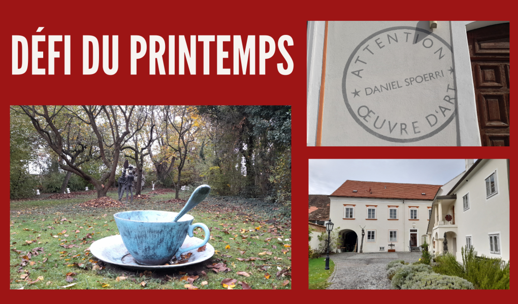 Le défi : Vous rendre au centre d’exposition de Daniel Spoerri et vous prendre en photo avec le label « Attention oeuvre d’art » de la façade. Vous avez jusqu’au 21 juin 2023 pour réaliser ce défi. Pour qu’il soit validé, il vous suffit de m’envoyer une photo ou une vidéo de vous ou de votre groupe à pomelilou[arobase]gmail[point]com ou sur messenger (photos et vidéos ne seront pas partagées et ne seront vues que par moi). Si vous le souhaitez, vous pouvez aussi les publier sur l’événement Facebook dédié au défi afin d’en faire profiter plus de monde. Vous pouvez aussi y passer un message pour convier des gens à relever le défi avec vous et partager une belle journée dans le Waldviertel !