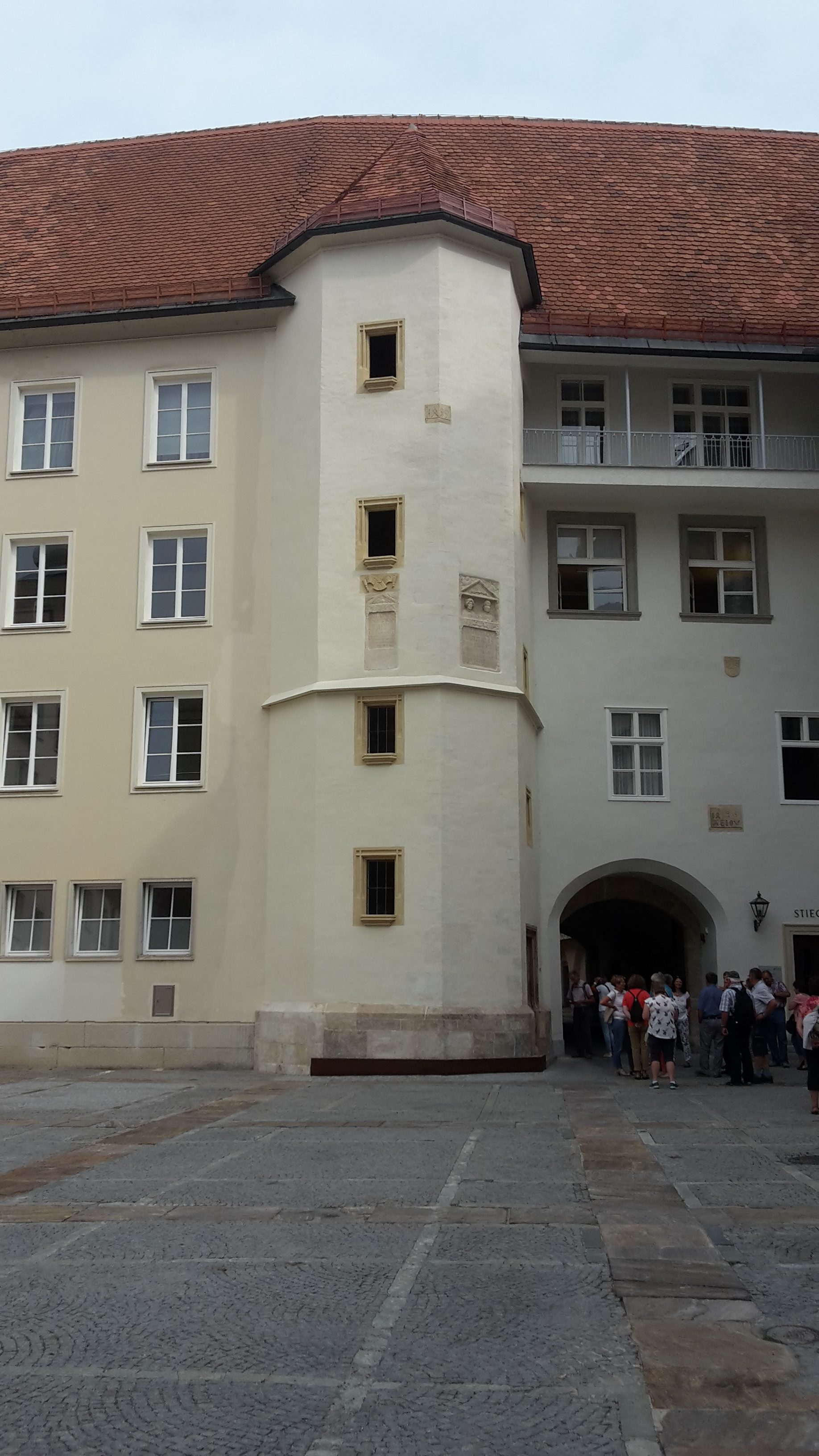 Pour la grande Histoire, figurez-vous que son commanditaire est le fameux Maximilien Ier de Habsbourg, connu pour avoir été empereur, mais aussi pour avoir été duc de Bourgogne en épousant l’héritière du duché, Marie de Bourgogne (la Bourgogne n’est jamais bien loin !). Il y poursuivit en effet les travaux commencés par son père pour édifier un château à cet endroit. Le complexe fut depuis fort remanié et abrite aujourd’hui des services du conseil régional de Styrie.
