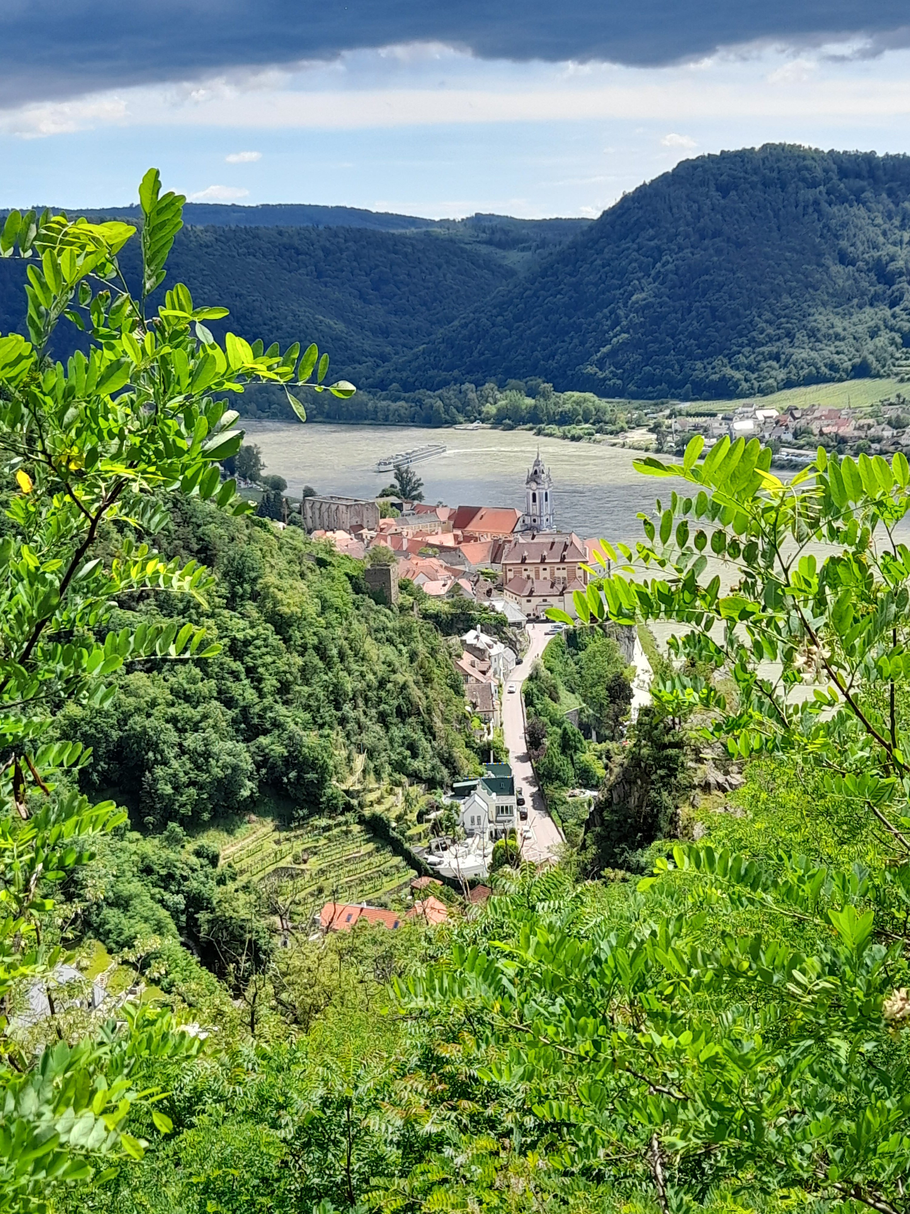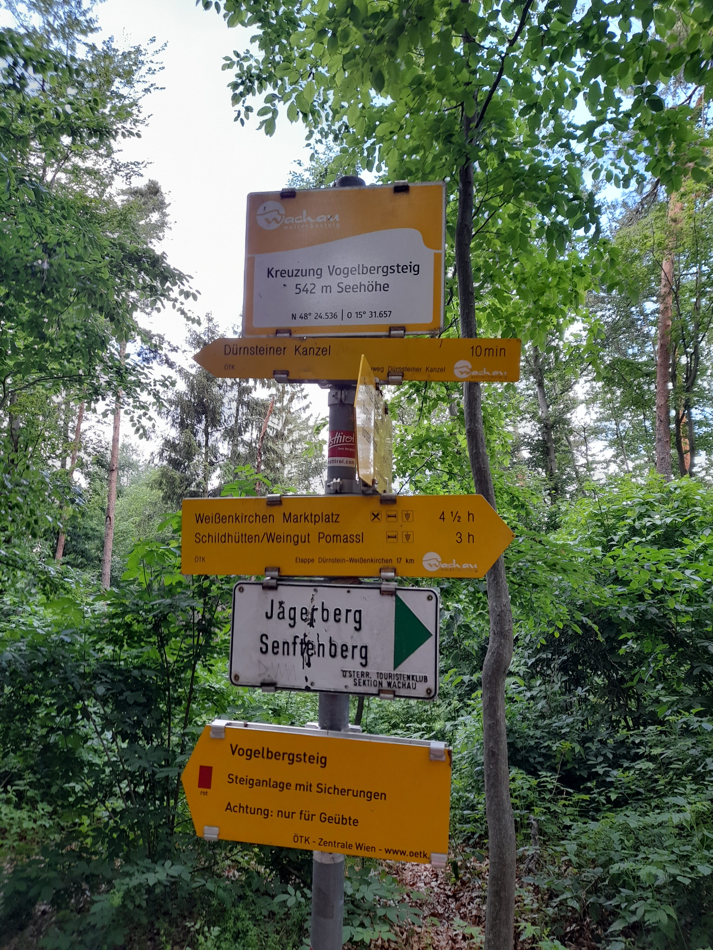 Quand vous êtes de retour au grand croisement, plusieurs options s’offrent à vous. Je vous invite à suivre le tracé du Welterbesteig Wachau qui est très bien balisé et qui est mon coup de cœur rando de l’année. Vous vous trouvé sur la 2ème étape. Soit vous suivez l’itinéraire qui vous ramène à Dürnstein en passant par sa ruine et en relevant le défi de l’été ! Après une petite montée, ce n’est presque que de la descente pas très abrupte sur 2,5 km. Soit vous suivez l’itinéraire pour vous rendre à la fin de cette étape à Weißenkirchen et profiter d’une longue balade en forêt puis un peu dans les vignes (environ 13,3 km).