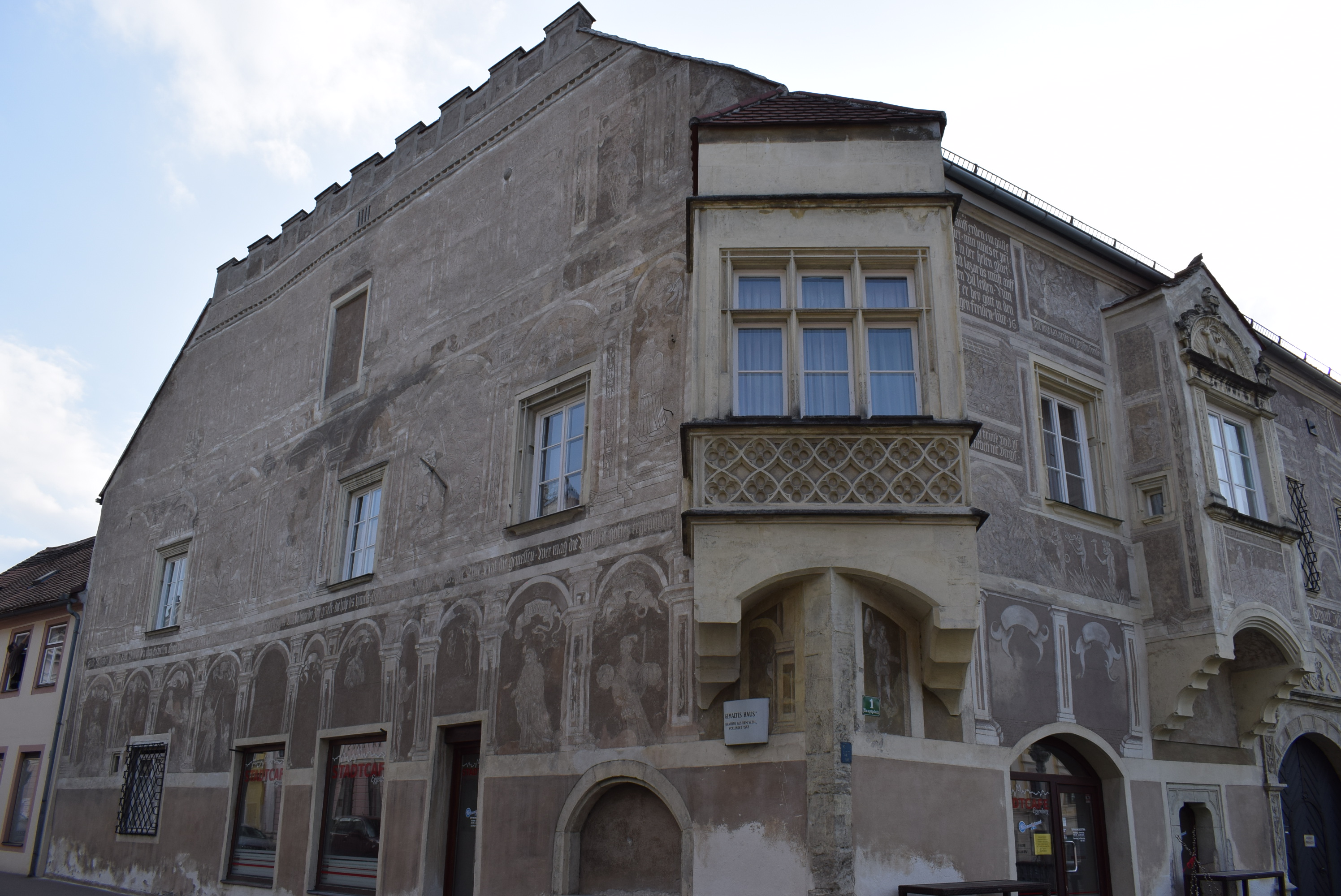 Une grande place avec de jolies bâtisses assez basses tout autour, une colonne de la peste et une colonne de la Vierge comme on en fait partout en Autriche. Oui ! Mais avec une incroyable maison, la Sgraffitohaus, couverte de gravures représentant des scènes de l’Ancien et du Nouveau Testament terminées en 1547. Une sorte de bande dessinée, où l’on reconnaît quelques gentils et quelques méchants célèbres. Là encore un véritable spectacle, dont on ne connaît pas tous les codes esthétiques, et qui nous porte ainsi dans un monde imaginaire.