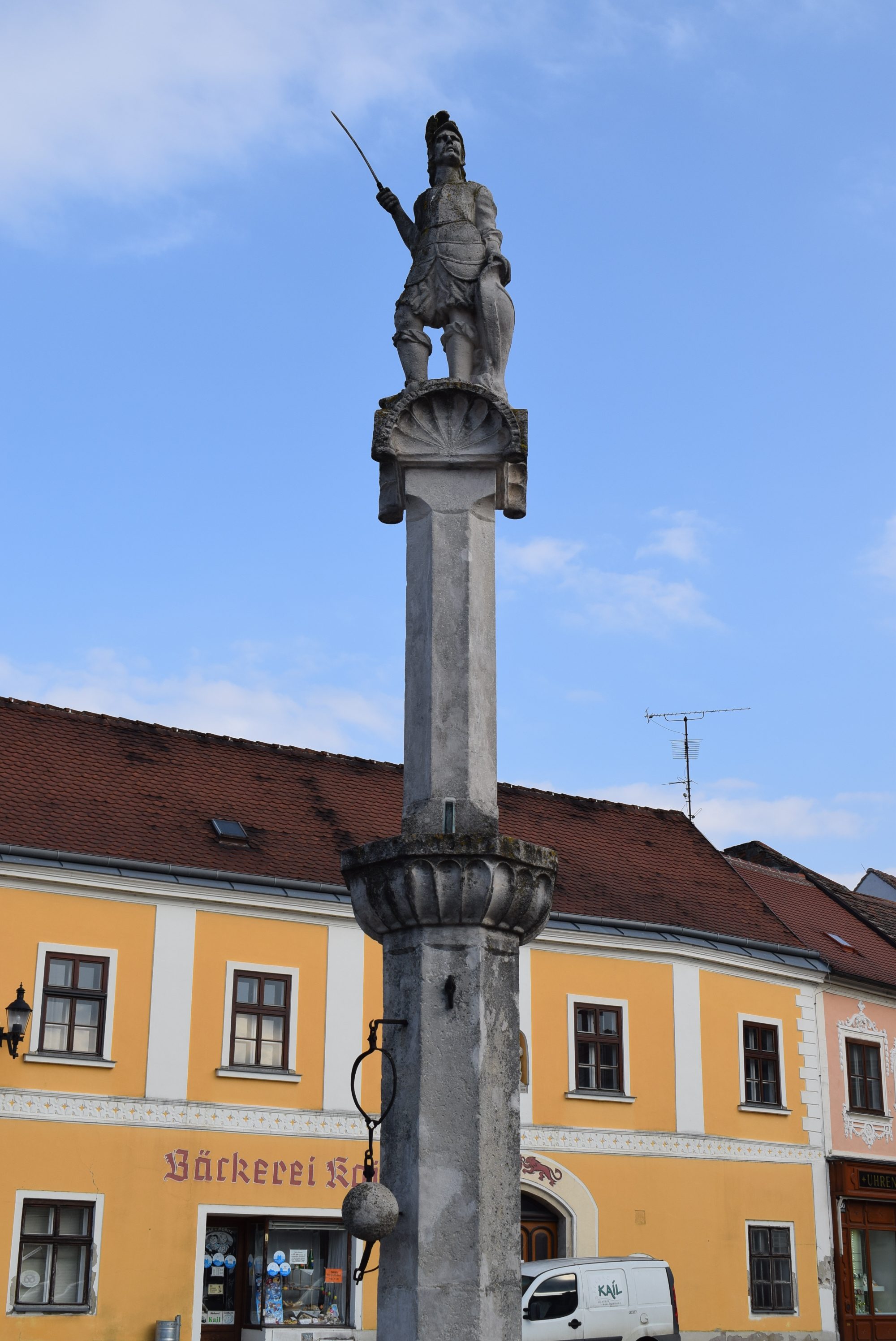 A côté, on a aussi une colonne assez originale qui porte un boulet et est surmontée d’un petit homme. Il s’agit du pilori de la ville, qui date du XVIème siècle. Le petit homme c’est saint Roland, et le pilori, en plus de faire peur, témoigne du statut d’Eggenburg à l’époque, ville libre, c’est-à-dire à même d’exercer sa propre justice et ses propres règles commerciales. La taille de la place rappelle d’ailleurs l’importance du marché qui pouvait y prendre place.