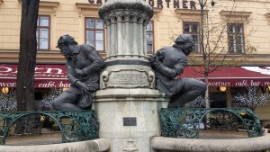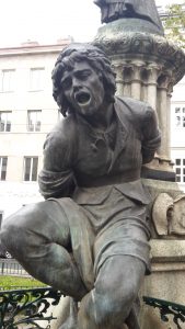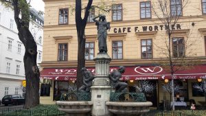 La première fois que je vis cette fontaine, j’étais stupéfaite. Je me baladais le long de la Wiedner Hauptstraβe, dans le 4ème arrondissement de Vienne, quelque peu perturbée par les va-et-vient des voitures et des tramways, quand je tombai sur une fontaine que je n’avais point vue venir. Elle illumina d’un coup ma promenade, dégagée de la rue sur sa petite placette, à l’ombre d’un bel arbre et devant un café viennois traditionnel. Une délicieuse jeune fille sculptée la surmontait. « Un ange » me dis-je alors. Je m’approchai de l’écriteau qui l’accompagnait et y lus « Engelbrunnen » (Fontaine de l’ange). C’était donc bien cela ! Je restais tout de même interpellée par les deux hommes qui s’étaient retrouvés attachés à ses pieds et dont le rôle était de déverser (ou plutôt cracher) l’eau dans le bassin de la fontaine. Il me fallait faire quelques recherches.