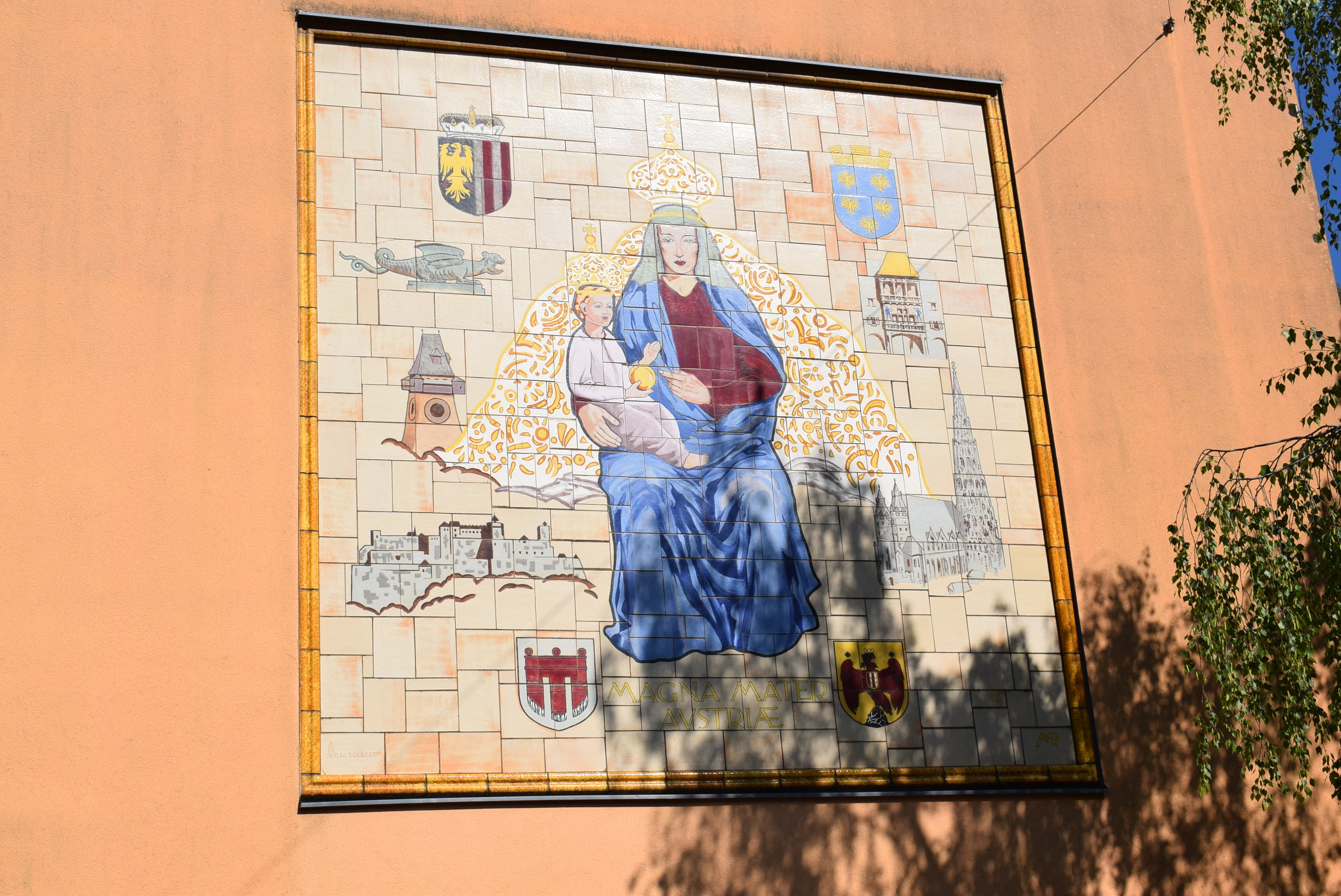 Juste derrière s’étend un grand ensemble d’immeubles dont les loyers ou prêts à l’achat bénéficient d’une aide de l’État (une fameuse Genossenschaft). Celle-ci est tout simplement baptisée « Heim » (le foyer, maison, pays ou localité). Il prend ici un sens historique puisqu’il fut inauguré en 1956, année suivant le rétablissement de la République autrichienne. Ce grand moment historique est célébré sur sa façade, avec une plaque commémorative et une fresque en céramique représentant la mère de l’Autriche (tout simplement la Vierge Marie) parmi blasons et monuments qui représentent chacun un Land du pays. A vous de jouer !