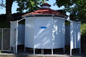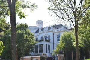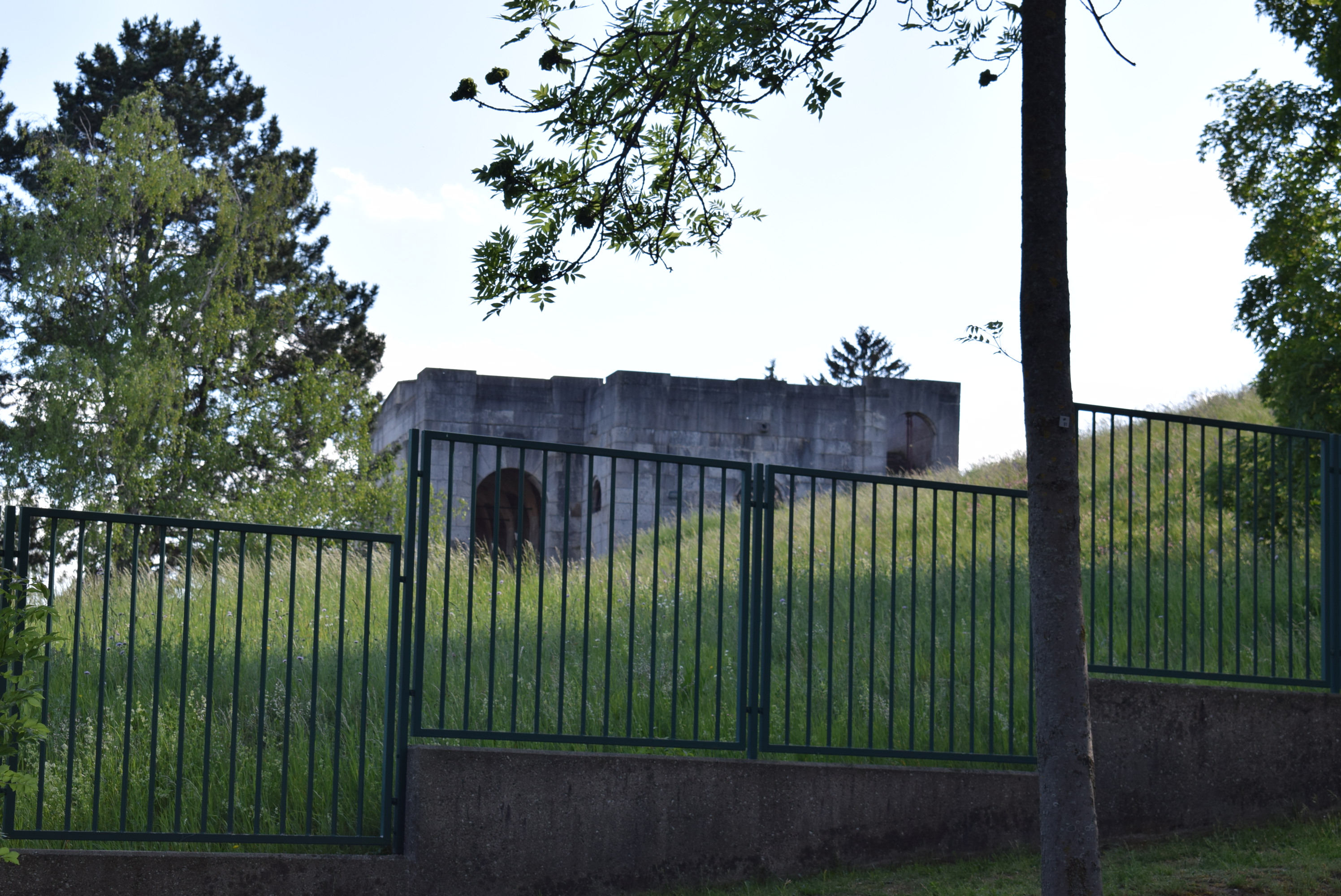 Puis sur la gauche, de nouveau une énigme, une curieuse construction sortant de terre, au milieu d’un parc bien entretenu et de cheminées sortant de la butte… Et de nouveau un réservoir d’eau ! Bien plus grand et bien plus imposant que le précédent.