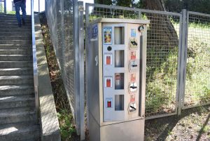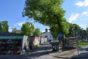 Allez, on monte ! On longe le cimetière. Son entrée principale, avec ses fleuristes et sa chapelle néoclassique. Ce cimetière a bien sûr été agrandi, mais les sources les plus anciennes évoquant un cimetière à cet endroit remontent à 1230. Plus haut, on passe devant une autre entrée, flanquée d’un distributeur à bougies pour les tombes (curiosité locale).