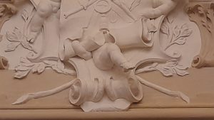 Au premier étage, je fus interloquée par ce dessus de porte très original dont semble sortir un bras et une jambe d’enfant potelé. Il est probablement purement décoratif, mais on peut lui chercher nombre de raisons d’être. Je n’en avais jamais vu de tel.