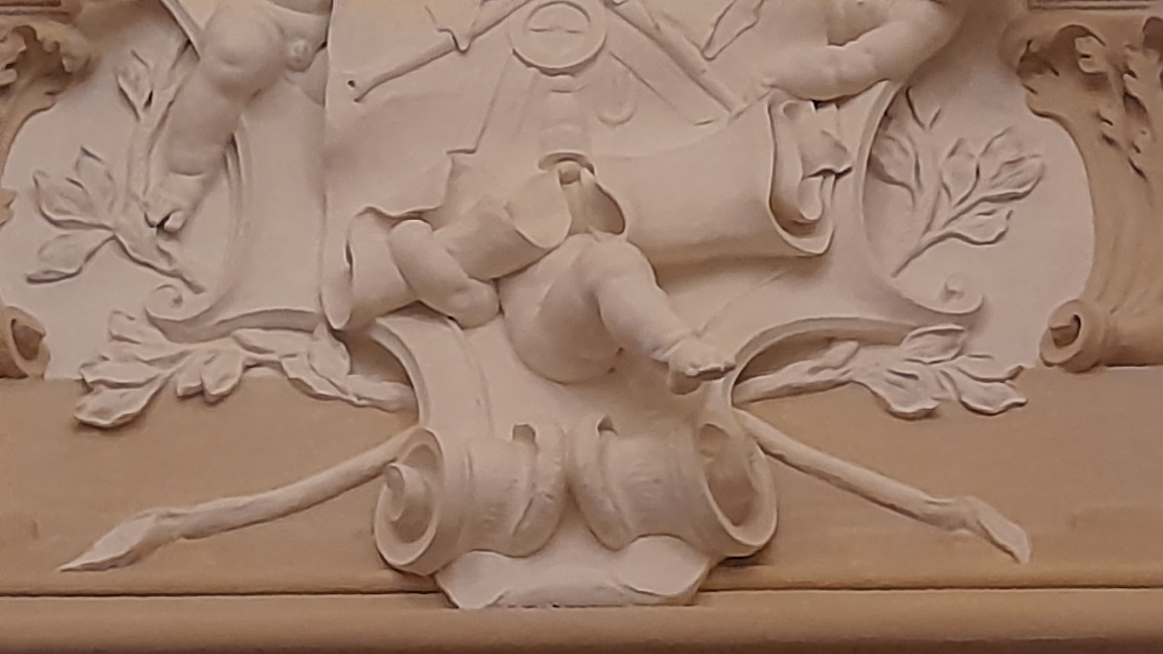 Au premier étage, je fus interloquée par ce dessus de porte très original dont semble sortir un bras et une jambe d’enfant potelé. Il est probablement purement décoratif, mais on peut lui chercher nombre de raisons d’être. Je n’en avais jamais vu de tel.