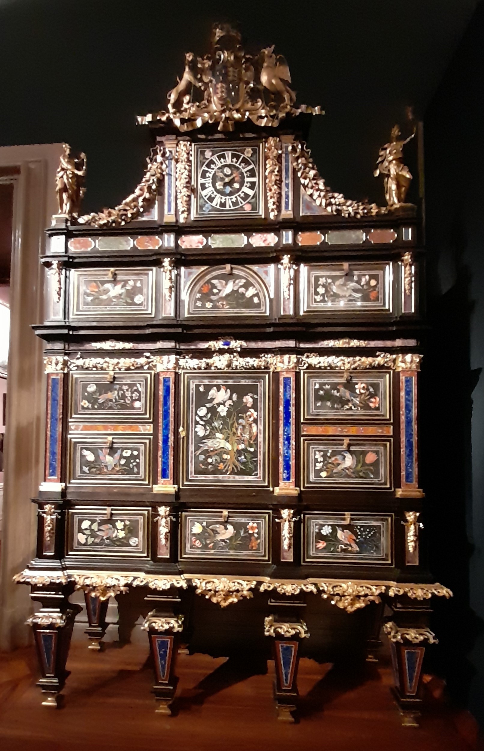 Le cabinet Badminton fut réalisé au XVIIIe siècle avec le concours des incroyables ateliers de pietra dura des Médicis à Florence. La pietra dura est un art qui consiste à réaliser des tableaux lisses en juxtaposant des pierres d’origines différentes et en utlisant leur aspect visuel pour composer le motif. Ce cabinet fut commandé par un duc anglais qui résidait à Badminton, d’où le nom donné à ce chef-d’oeuvre. Approche-vous bien près pour en admirer les détails. Le prince Jean-Adam II de Liechtenstein en fit l’acquisition en 2004 pour 17 millions de livres sterling, soit 24,6 millions d’euros à l’époque, ce qui donna un autre surnom au cabinet, celui de meuble le plus cher du monde.