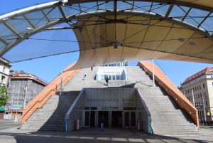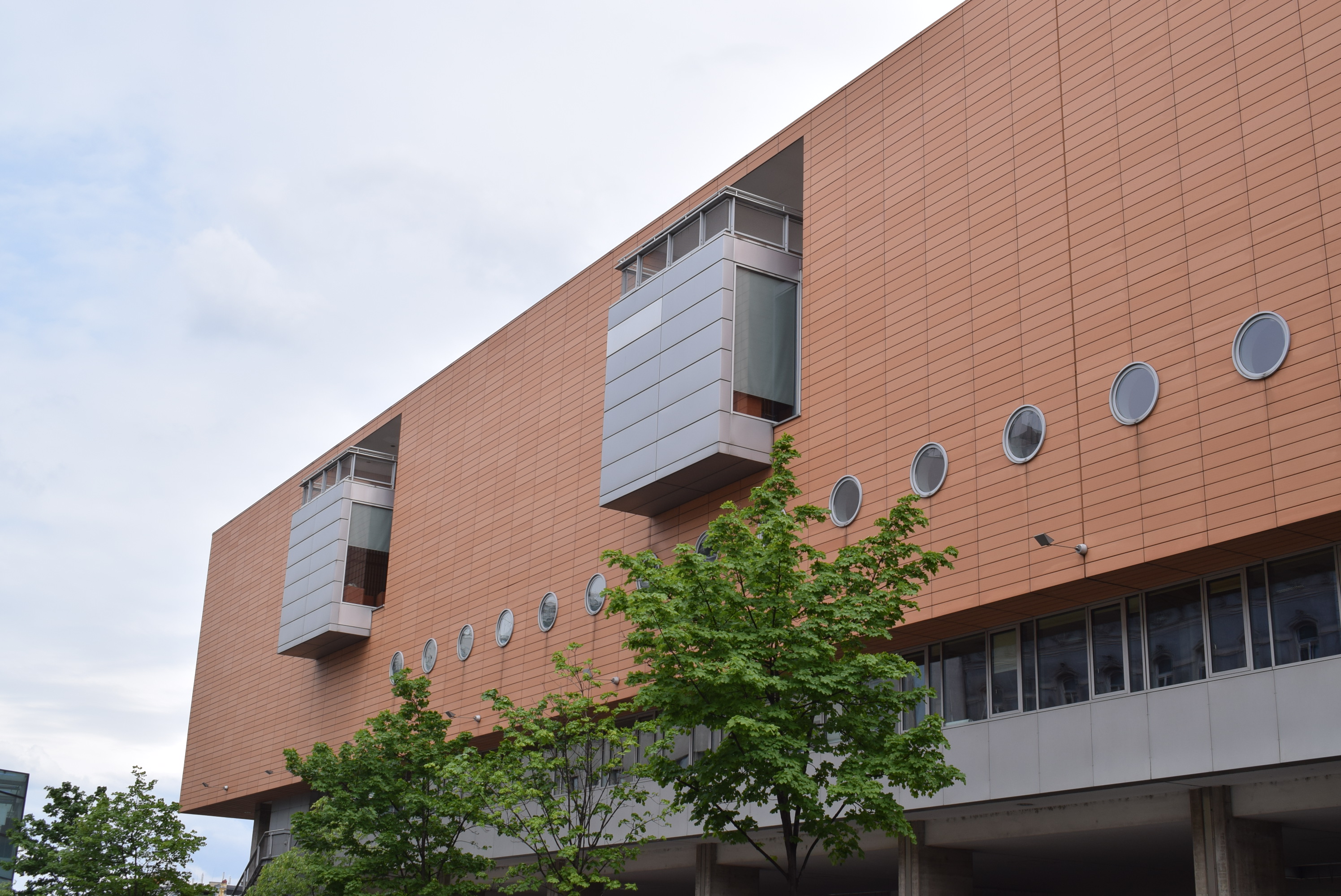 Il a fallu qu’Eric Vuillard, un écrivain que j’apprécie beaucoup, vienne y faire une présentation pour que je me rende enfin à la bibliothèque municipale centrale. Elle se trouve en effet à seulement cinq minutes à pied de chez moi. Je me sentais assez honteuse mais tentais de masquer cela par une curiosité exacerbée. En réalité je m’étais déjà rendue sur place, mais n’étais simplement pas entrée à l’intérieur. J’avais seulement arpenté l’escalier monumental qui lui sert de façade et son toit-terrasse abritant un café fort sympathique afin de voir l’horizon qu’ils offraient sur la ville.