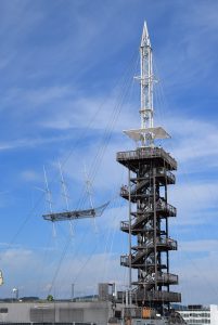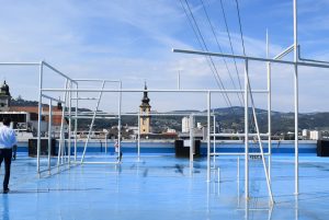Il est alors temps d’escalader cette fameuse tour en sapin appelée tout simplement tour de la Haute-Autriche, amusant pour une région qui tire principalement sa richesse du travail du métal. 160 marches plus loin (on ne se rend même pas compte qu’on les monte ! Le navire aimant certainement !) on domine la ville à 55 mètres de haut ! Ce parcours sur les toits qui mène presque au sommet de la tour a un nom : L’ivresse de la hauteur (Höhen Rausch). Il sert de décor à des expositions depuis quelques années, mais il est fort probable que celle dédiée à l’eau soit la dernière pour des raisons financières. L’avenir de cet endroit qui invite au rêve, à la réflexion et à explorer la ville semble aussi incertain que la perspective d’une paix mondiale liée à l’eau. Alors foncez-y ! Vous avez pour sûr jusqu’au 14 octobre pour tremper dans ce parcours si original.