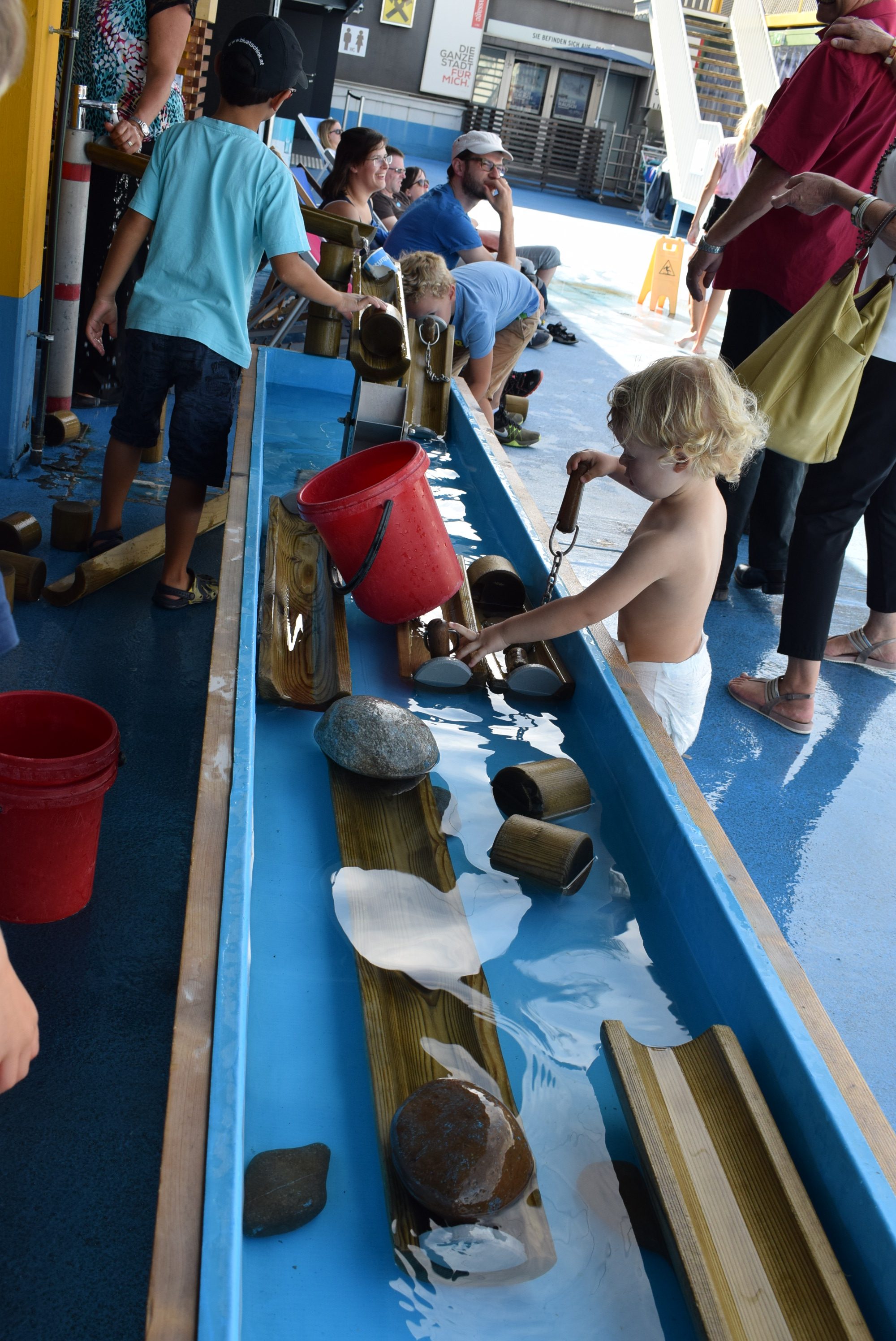 Un signal pour l’exposition qui semble voler sur la ville et qui agit sur nous comme un aimant. Il nous pousse à gravir la tour en bois qui le jouxte. En s’y rendant, on se retrouve les pieds dans l’eau sur le toit d’un ancien parking où de nombreuses activités attendent les plus jeunes d’entre nous.