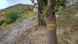 14,5 km. L’étape commence à la Kirchenplatz de Spitz, mais il est plus pratique de commencer depuis l’arrêt de bus de Spitz (Spitz/Donau Hinterhaus). Cette section dans Spitz fait de toute façon également partie de la dernière étape du tour du Jauerling. C’est une de mes étapes préférées. En plus, je l’ai faite à l’automne et les couleurs des arbres étaient magnifiques. On commence par monter à la ruine de la forteresse de Hinterhaus. Je ne me rendais pas compte de son envergure depuis la route. Elle est magnifique et offre un point de vue sur la vallée du Danube et les vignes en terrasses à couper le souffle. En forêt, on tombe sur plusieurs roches surprenantes typiques des foêts bordant la Wachau. On passe ensuite par le petit village de Schwallenbach qui est plein de charme, et on marche à travers les vignes pour arriver à Willendorf, d’où est originaire la célèbre Vénus qui porte son nom. Il s’agit de l’une des statuettes les plus importantes de la préhistoire européenne. Un petit musée lui est dédié sur place, mais l’originale se trouve au musée d’histoire naturelle de Vienne (ici l’article que je lui ai dédiée).