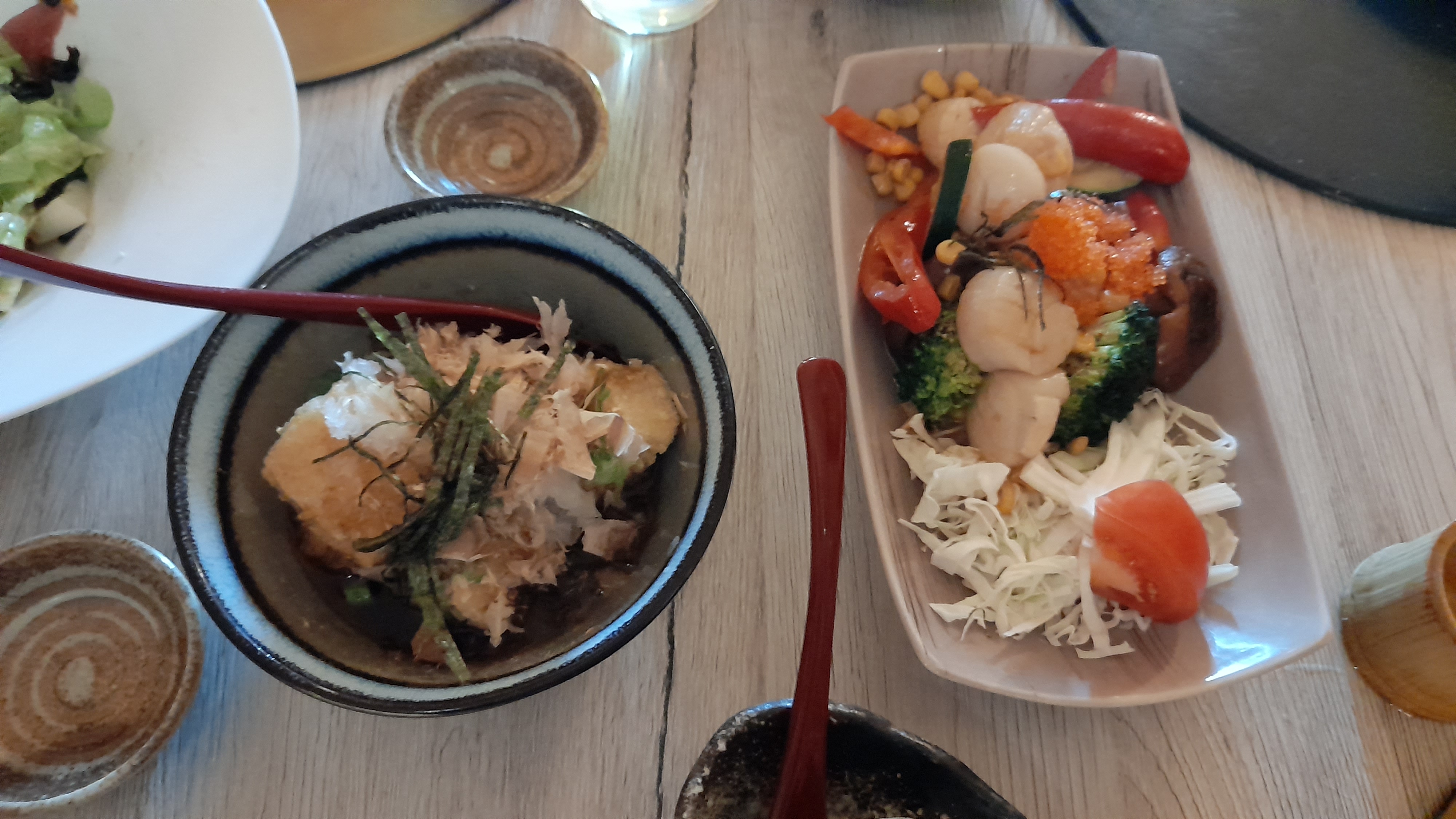 On ne peut pas dire que l’on ait perdu au change en venant chez Nihon Bashi, surtout que je souhaitais y dîner mais que le restaurant affichait déjà complet quelques jours auparavant. Pensez donc bien à réserver à l’avance si vous souhaitez vous y rendre et à préciser que vous souhaitez être dans la partie tatami si vous souhaitez avoir cette expérience de manger sur un autre type de table (il ne s’agit pas d’une version traditionnelle puisqu’il y a une fosse pour les jambes sous la table, ce qui est beaucoup plus confortable et aussi très courant au Japon). Le restaurant possède aussi une salle de karaoké que l’on peut privatiser et dans laquelle on peut également dîner. Celle-ci doit cependant être réservée plusieurs semaines à l’avance pour les vendredis et samedis soirs. J’ai demandé à Wakana de choisir des plats typiques, car outre les sushis et les ramen, je connaissais alors très peu la cuisine japonaise. Résultat, j’ai découvert plusieurs mets que les Japonais mangent au quotidien, et surtout des saveurs qui m’étaient jusque-là inconnues. Nous avons par exemple mangé des graines de soja fermentées (nattō) que j’ai beaucoup aimées. Cela m’a fait pensé à du roquefort. Et nous avons bu du thé vert mélangé avec du riz grillé (Genmaicha). J’ai adoré et depuis j’en bois très régulièrement.
