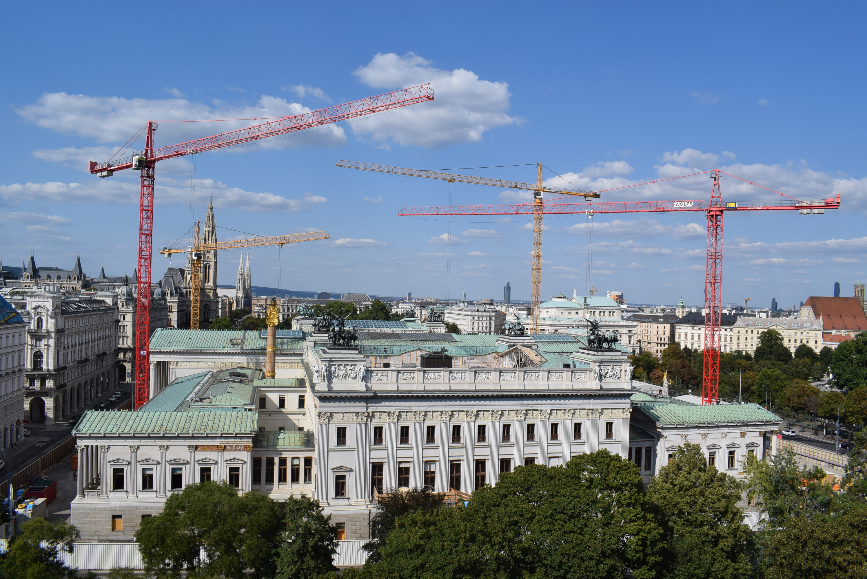 La terrasse offre une belle vue sur la partie du Ring faisant face au palais. On peut d’ailleurs actuellement bien se rendre compte de l’ampleur des travaux déployés sur le parlement. On peut également s’amuser, comme nous, à deviner à quels monuments appartiennent les dômes que l’on voit parmi les toits de la ville. Je remarquai aussi que la Tour Millenium est par exemple bien plus près à vol d’oiseau que la DC Tower. L’AKH (hôpital général) prête bien évidemment toujours à sourire par son envergure et la façon peu élégante avec laquelle il bouche en partie la vue sur les collines de la forêt viennoise.