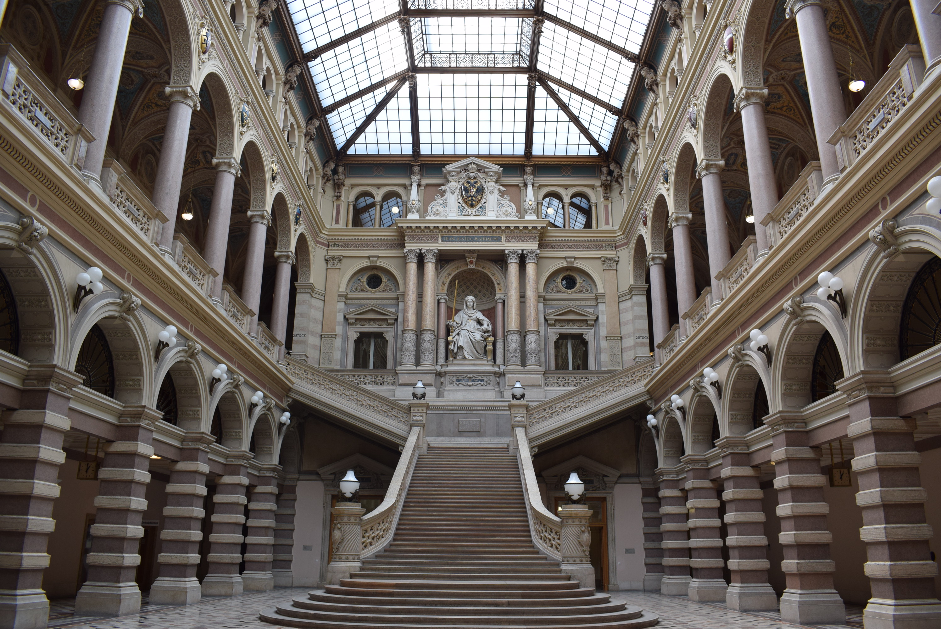 On m’avait plusieurs fois parlé de cette cafétéria se trouvant sur les toits du palais de justice de Vienne, et à laquelle on peut accéder sans y travailler ou y être convoqué ! Ce n’est pourtant que la semaine dernière que je m’y rendis pour la première fois avec une amie, une amie avec qui j’organise de temps en temps des conférences sur l’histoire de Vienne. Après une fouille très minutieuse de nos sacs nous découvrîmes un élément du palais auquel je n’avais curieusement pas pensé en venant, son hall. Un espace exceptionnel sur lequel un majestueux escalier semble tranquillement déverser ses marches et une statue représentant la justice parait veiller sur nous. J’étais tout simplement bouche bée.