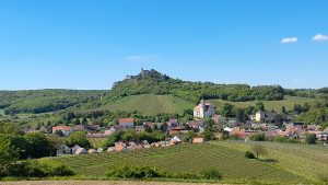 On commence ensuite à distinguer au loin la ville tchèque de Mikulov avec sa grosse colline, son château et son église qui nous donnent bien envie de nous y rendre. Puis vient une autre colline dans notre champs de vision, celle de Falkenstein et sa forteresse en ruine, au pied de laquelle on va passer.