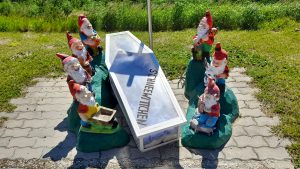 On emprunte ensuite sur moins de 2 km une route avec une circulation jusqu’à 100 km/h avec très peu de circulation et une bonne visibilité. Le long de celle-ci, de curieux fils à linge exposant des chaussettes nous accueillent. Ils annoncent tout simplement notre arrivée à Herrnbaumgarten, un village où on aime les projets un peu foufous et surtout créatifs et distrayants.