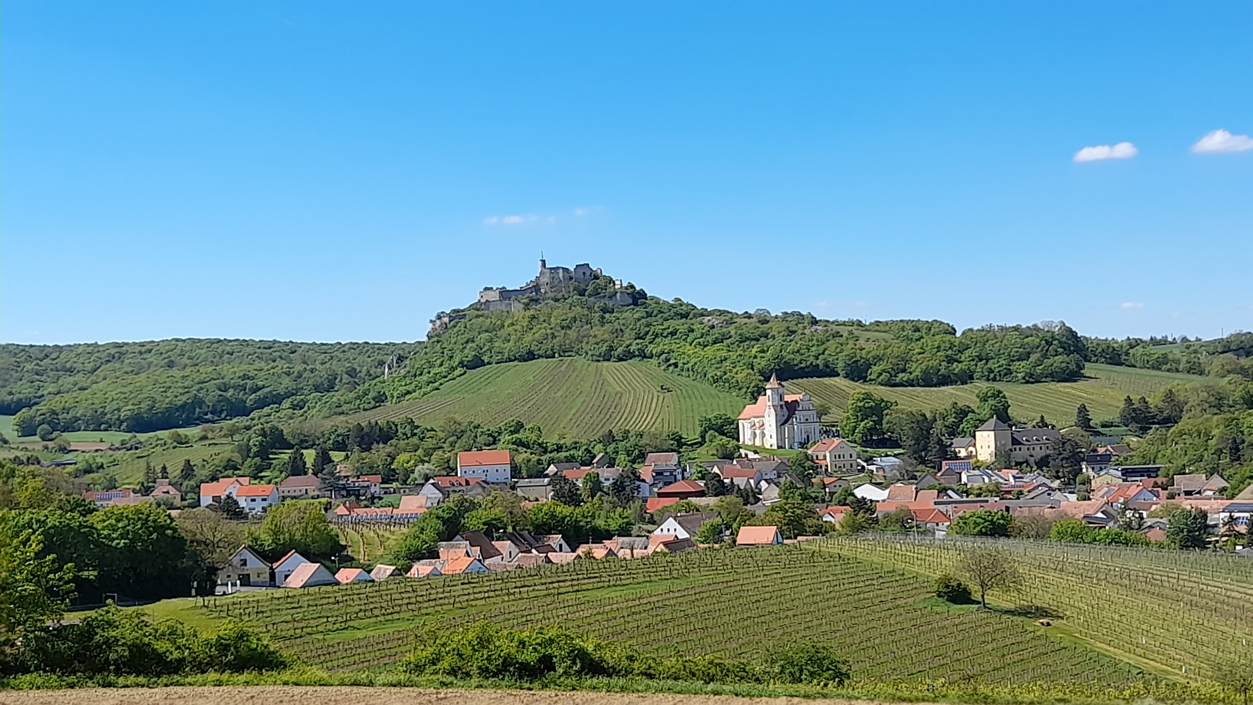 FALKENSTEIN (28e km) : Superbe Kellergasse par laquelle on passe. On surplombe ensuite le village et on profite d’un beau point de vue sur la forteresse en ruine.