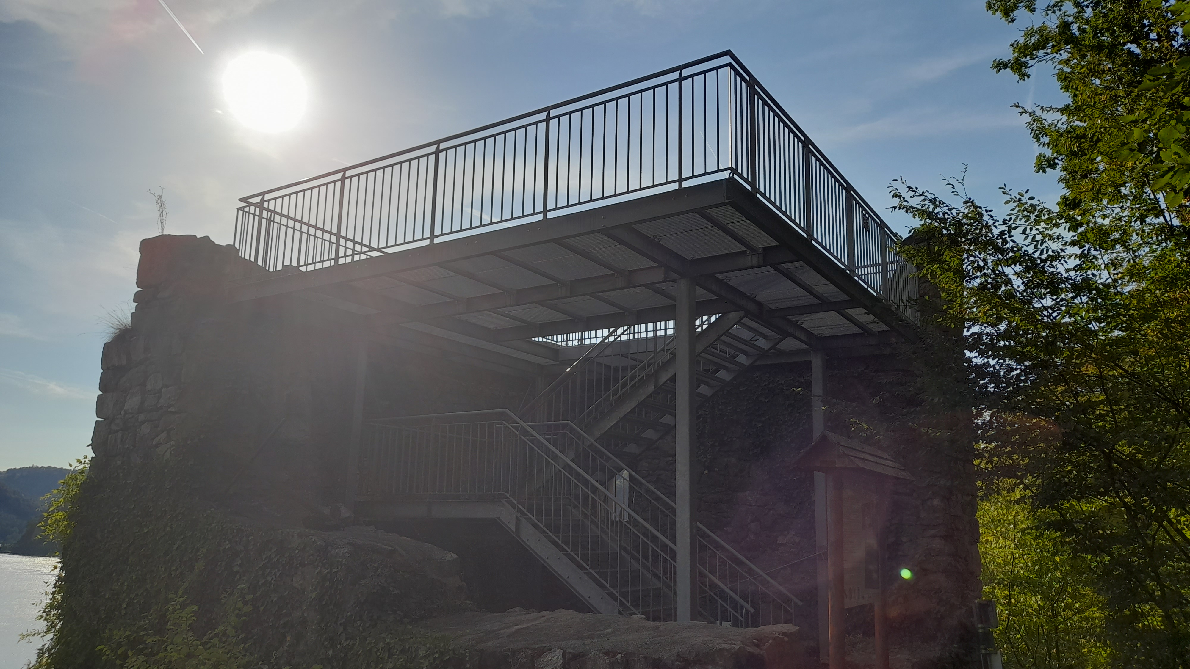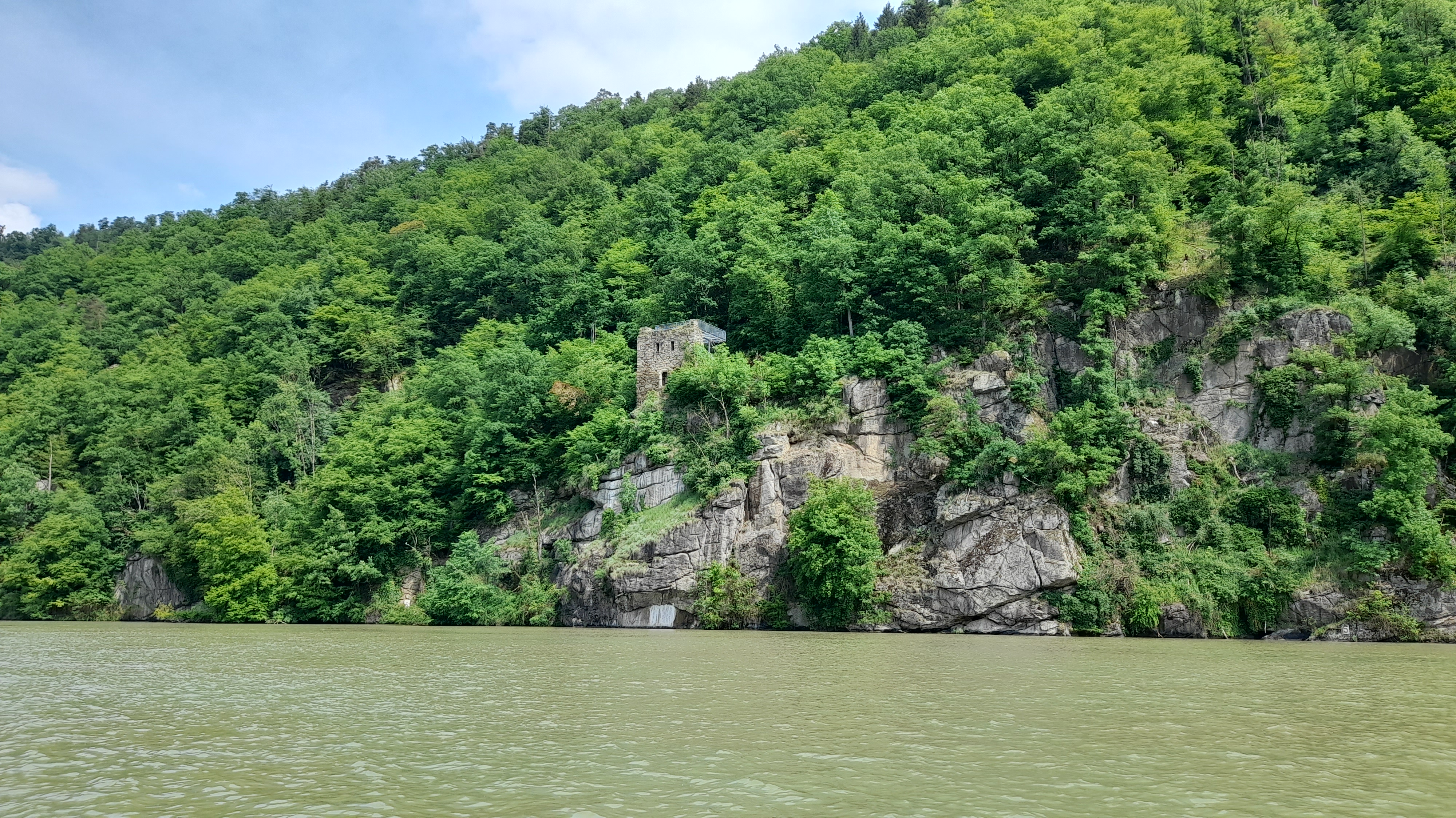 De la tour, il ne reste partiellement que trois murs, ainsi qu’une porte et deux fenêtre. Plus de toit, plus d’étages, ce qui a permis d’y installer une structure sécurisante dotée d’une grande plate-forme pour observer le Danube. C’est pour moi, avec la Wachau, un des coins de l’Autriche où le fleuve est le plus beau, au cœur de ce massif granitique et boisé.