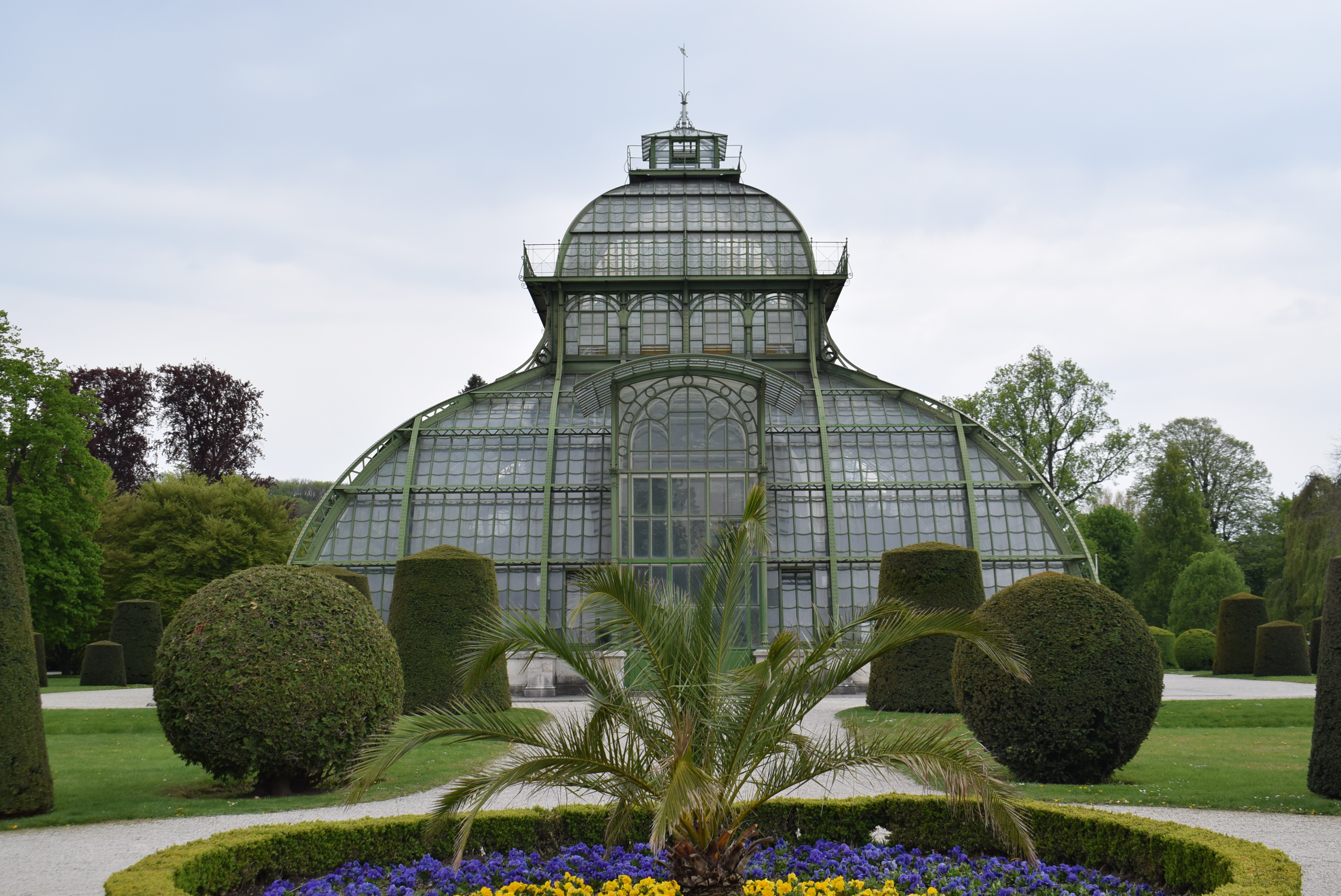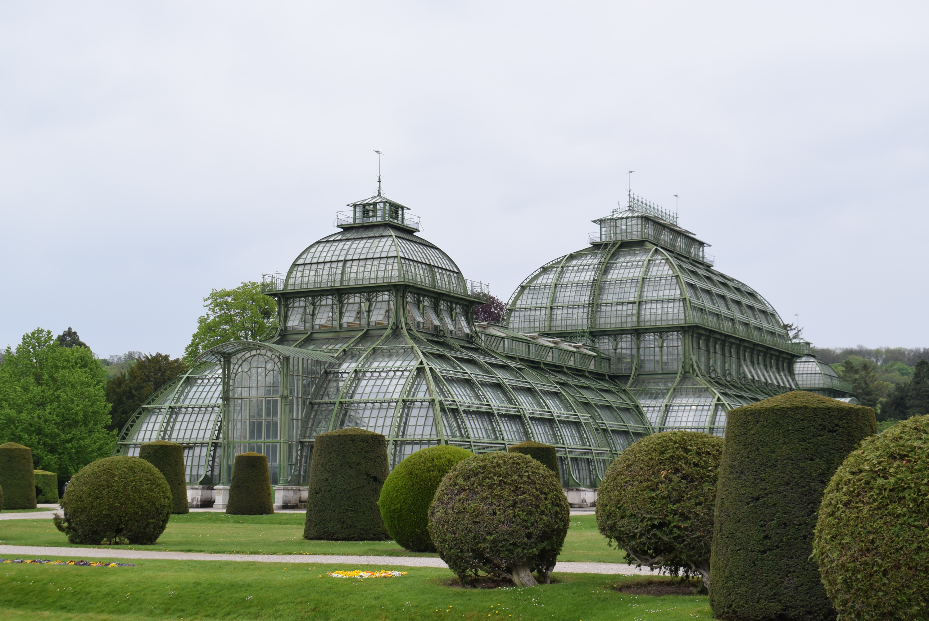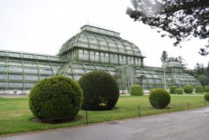 En cette fin XIXème, les grandes villes voient pousser des structures en fer alors d’une grande modernité, et parmi elles de grandes serres pour agrémenter parcs et jardins. L’empire austro-hongrois se doit lui aussi de prendre part à ce mouvement de célébration des techniques nouvelles. L’empereur François-Joseph (1830-1916) décide donc de la construction de celle qui sera la plus grande serre du monde. Stylistiquement parlant, on ne peut dire que son architecte Franz Xaver Segenschmid ait fait preuve d’une grande créativité. Si vous avez déjà vu la grande serre victorienne des Kews Gardens de Londres, vous remarquerez que celle de Schönbrunn lui ressemble énormément. Le bâtiment est en effet divisé en 3 pavillons dont celui du milieu domine par sa hauteur. L’édifice viennois a lui aussi une structure en fer forgé et en fonte (respectivement 600 et 120 tonnes) et est couvert de verre (45 000 vitres couvrent une surface de 4 900 m2). L’ensemble fait 113 m de long et culmine à 28 m de haut avec le pavillon central. Le temps aidant, les détails, notamment au niveau des courbes, sont plus élégants à Schönbrunn. Cela n’empêcha pas la serre d’être au cœur de nombreuses critiques après son inauguration pour son architecture des plus dépaysantes et son coût. Les dépenses ne s’arrêtèrent pas là puisque l’entretien du bâtiment n’est pas aisé et surtout que trois bombes l’endommagèrent énormément, comme sa collection de plantes, lors de la Seconde Guerre mondiale.