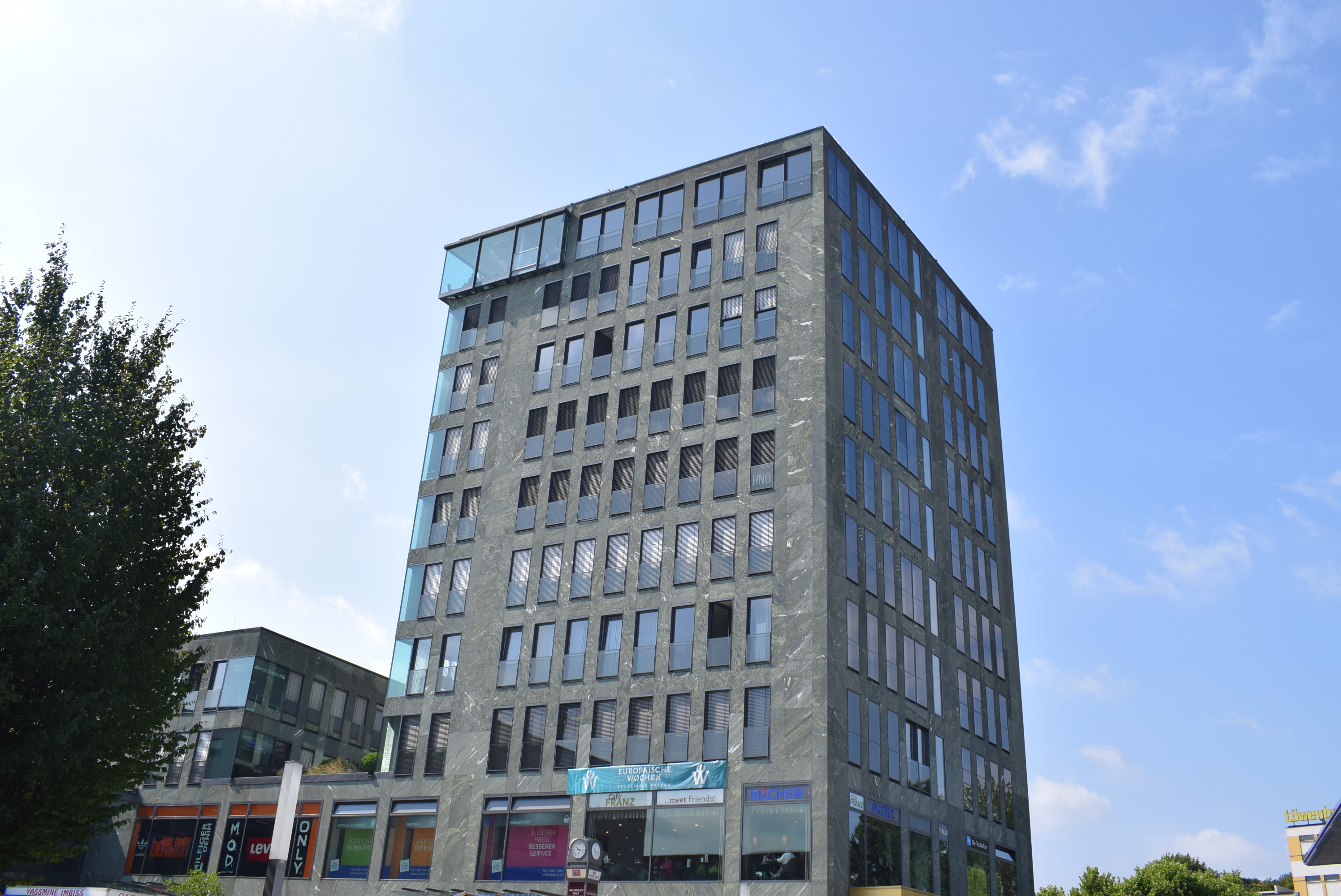 A côté, un immeuble à l’architecture épurée couvert de plaques de pierres volcaniques vertes, rappelle lui aussi l’architecture italienne, mais cette fois-ci plus récente.