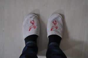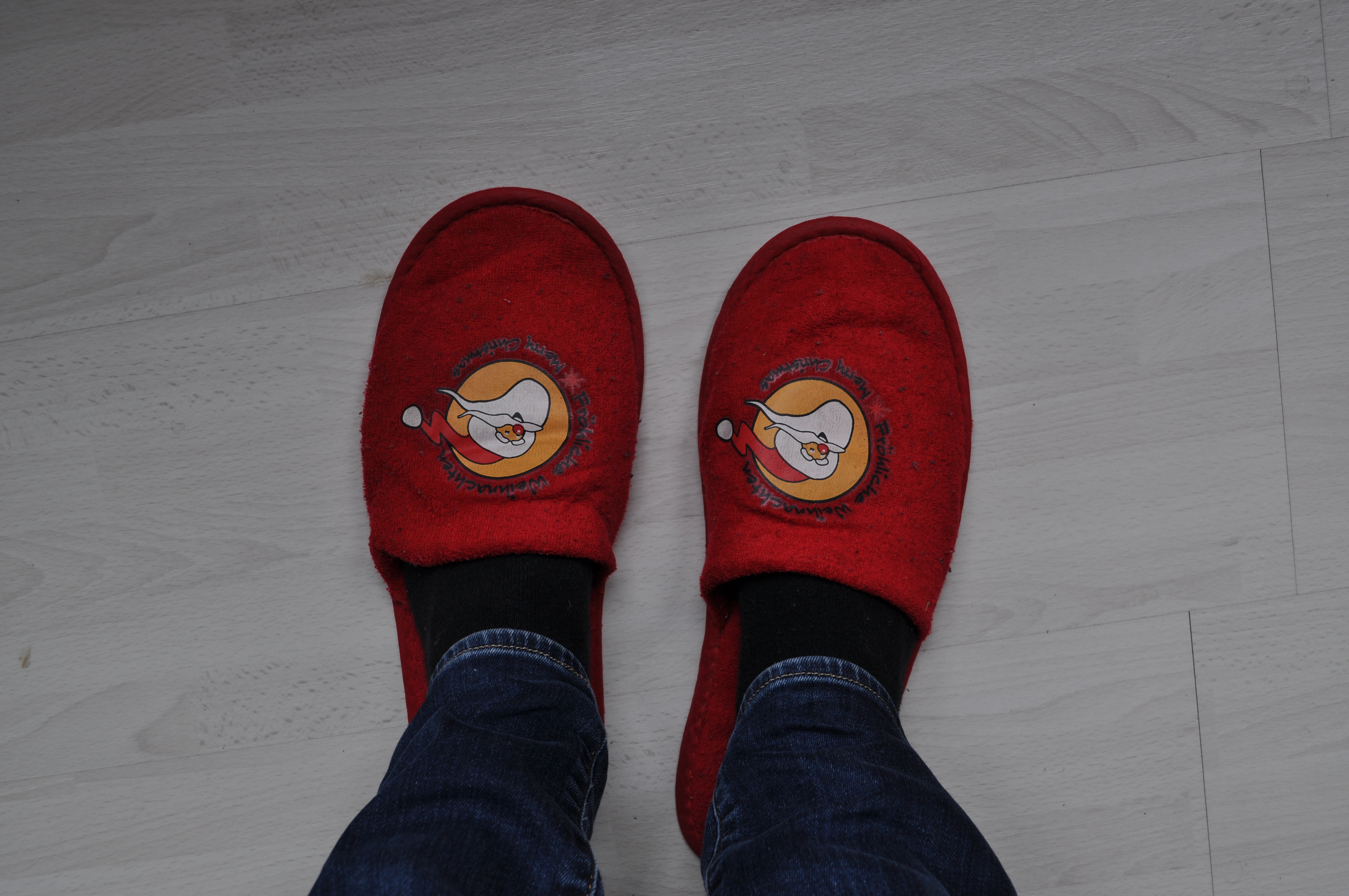 Ainsi fus-je surprise de l’habitude, que je qualifiai alors « d’autrichienne », d’ôter ses souliers en arrivant chez quelqu’un. Les montagnes de chaussures en tous genres qui s’étalaient dans les entrées lors d’une soirée me semblaient démesurées. Les hôtes allaient quand même bien faire le ménage après la soirée ! Je remarquai aussi dans l’école où je travaillai que les élèves et les membres de l’administration portaient des chaussons ou des chaussures strictement réservées aux intérieurs. N’avions-nous personne pour faire le ménage à l’école ? Cela me semblait extrême et presque déplacé. Enfin tout cela, c’était avant les premières chutes de neige. Là je me rendis compte que c’était quand même bien de ne pas avoir de flaques d’eau sous son bureau et des couloirs qui ne ressemblaient pas à des patinoires. Je pris alors conscience de l’intérêt des patins et courus m’en acheter (on en trouve dans les drogueries et presque tous les supermarchés), pour les porter et les faire porter à mes invités ! Il est vrai que depuis, mon appartement est bien plus propre, surtout après avoir reçu des amis pour une petite soirée. Merci mes beaux patins ! <3 <3 <3 Si vous aussi vous en avez et portez, pensez à leur témoigner un peu de gratitude 😉