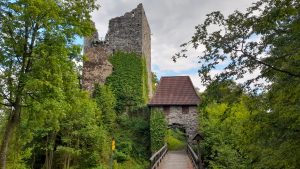 Le chemin pour la ruine est malheureusement peu indiqué. On suit les balisages du sentier de grande randonnée Donau Steig dans le sens inverse. Celui-ci est aussi balisé par les marquages bleu/blanc/vert.
