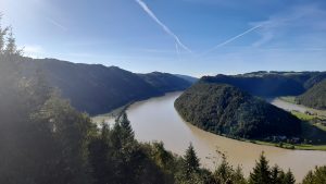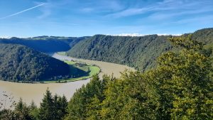 Il s’agit du plus beau point de vue sur la boucle. Pour l’aller-retour, compter ¾ d’heure à une heure de marche pour les quelques 3 kilomètres à parcourir. Suivez les panneaux de randonnée indiquant « Schlögener Blick 30 min. » situés en face du grand hôtel. Il faut en effet près d’une demi-heure pour arriver au point de vue. Ça grimpe, mais la vue est époustouflante. Si jamais vous trouviez l’ascension trop difficile, lancez vous quand même, une petite clairière à mi-parcours offre déjà un bel aperçu sur cette merveille de la nature.