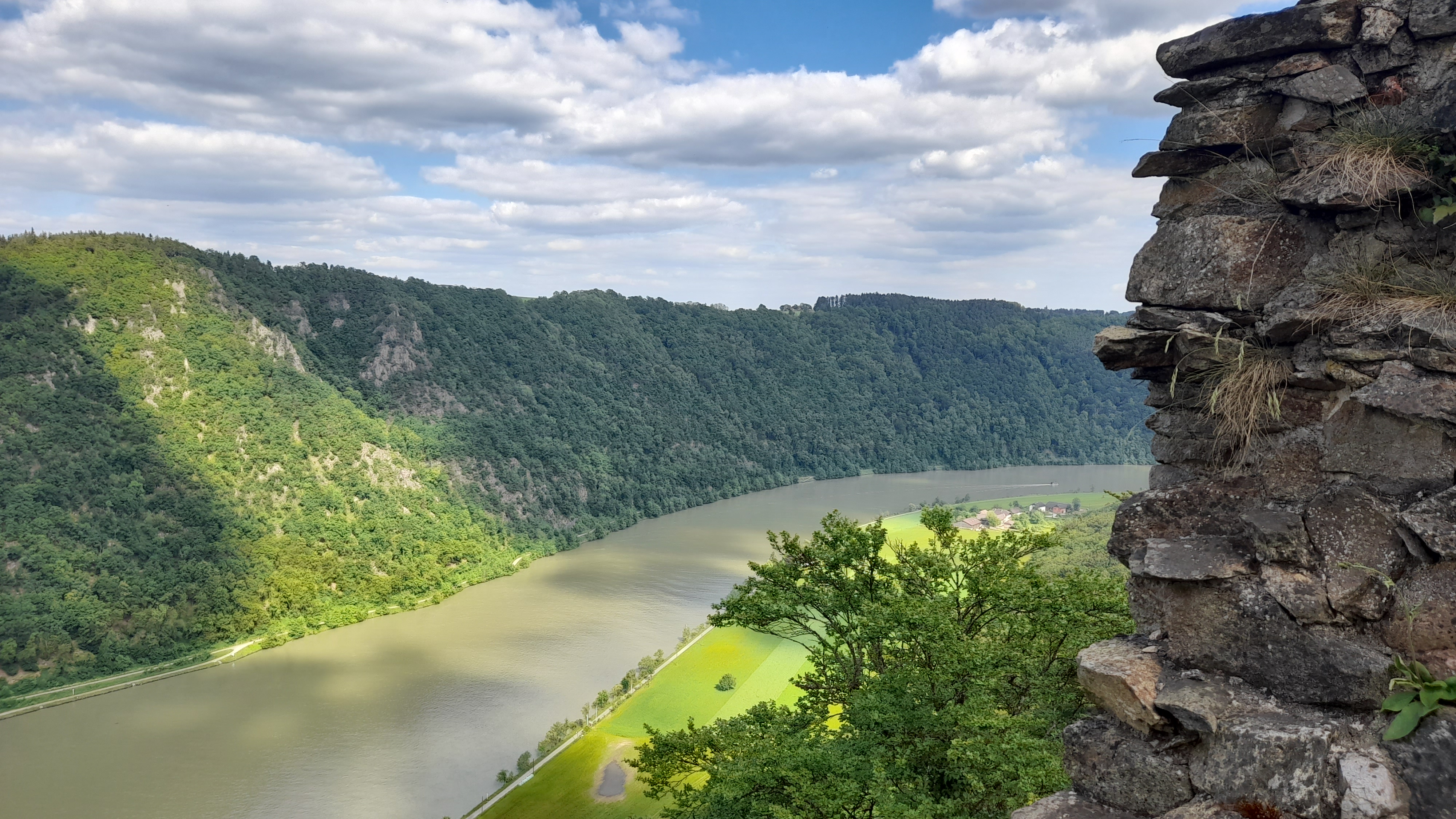 Ca grimpe, mais plus tranquillement qu’à Schlögen. Sur le chemin on a aussi de beaux points de vue sur la vallée. Une structure avec des escaliers très sécurisants permet de monter en haut de la tour, ou de ce qu’il en reste, pour profiter d’un point de vue panoramique sur la boucle.