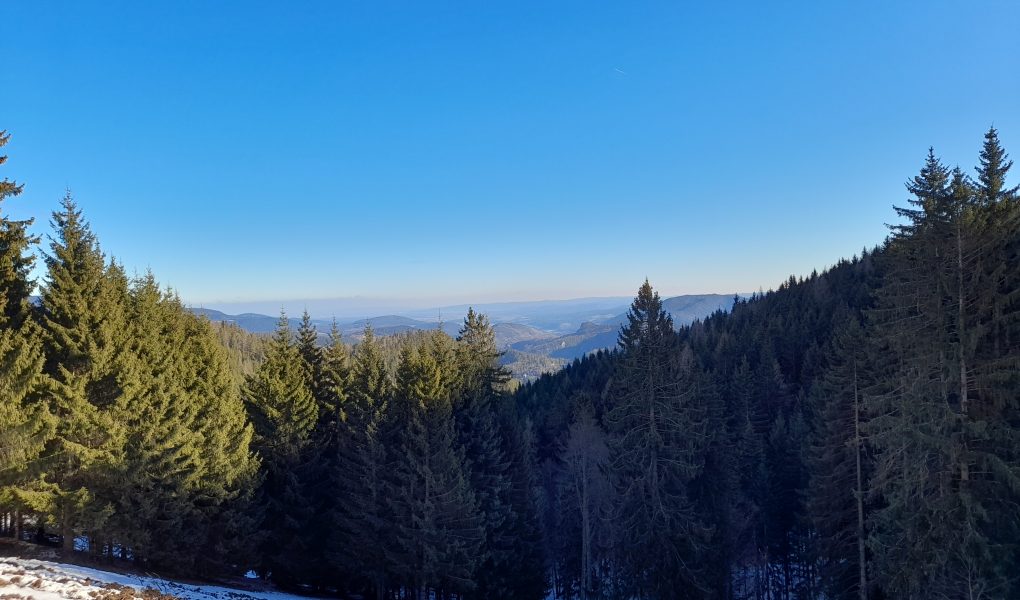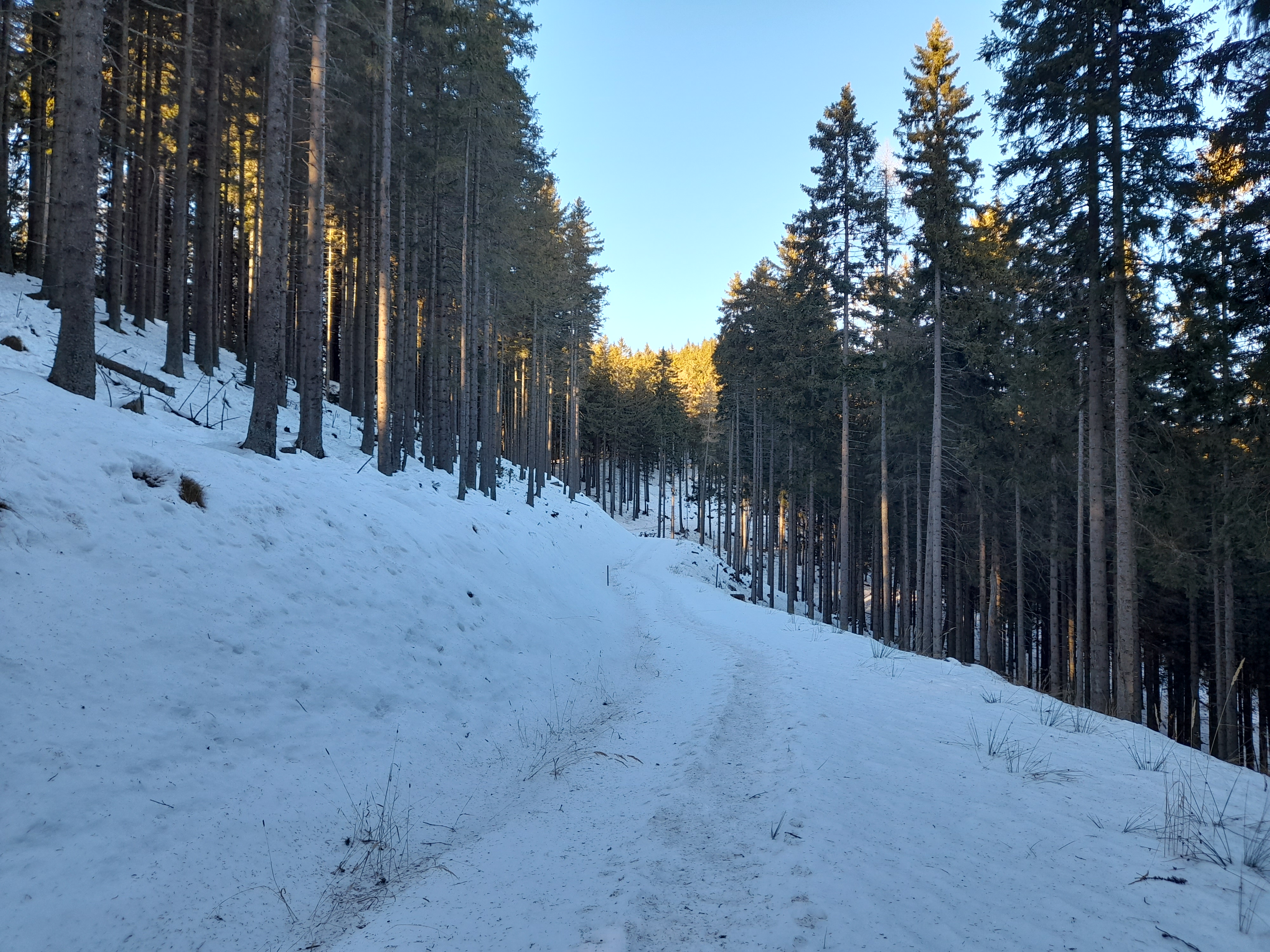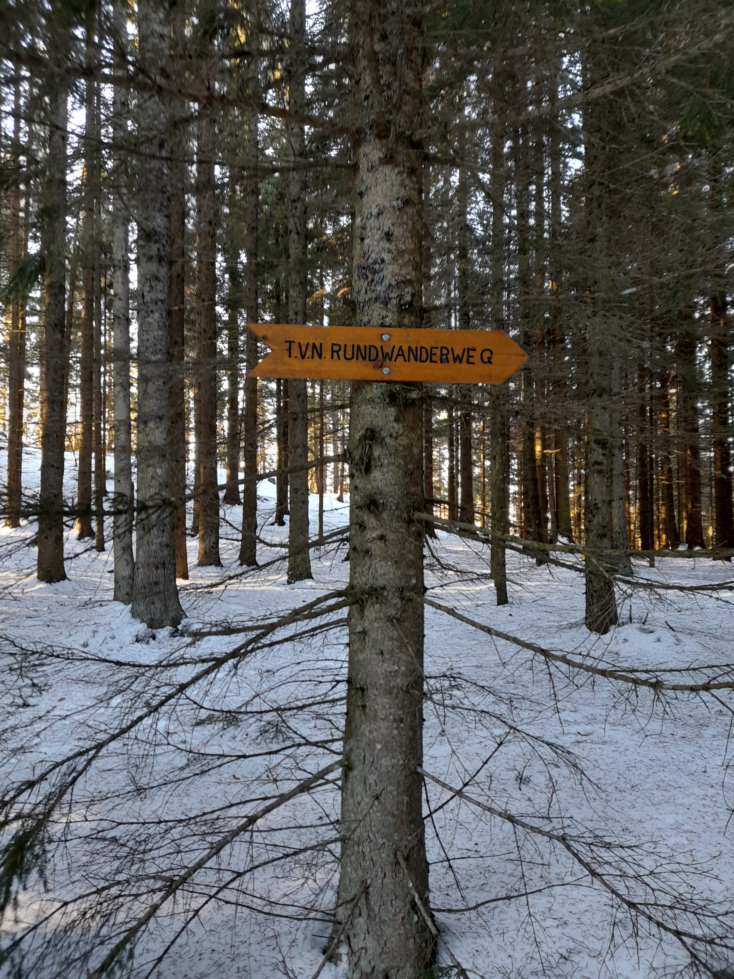 Le parcours de randonnée que j’ai suivi est une boucle qui s’appelle « TVN Rundwanderweg ». Il fait 11 kilomètres de long, nous fait monter (sans pentes trop raides) de près de 1000 mètres à 1300 mètres d’altitude sur les quatre premiers kilomètres, puis redescendre gentiment vers la ville pour revenir au point de départ. Comptez environ 3 heures. La randonnée se fait tout au long de l’année avec des chaussures de randonnée. Suivant la météo, prévoir crampons ou bâtons, voire raquettes. Lorsque je l’ai faite, il n’y avait pas assez de neige pour les raquettes, mais le terrain était glissant à certains endroits et j’étais donc rassurée et assurée avec mes bâtons.