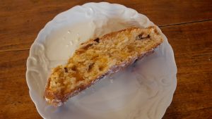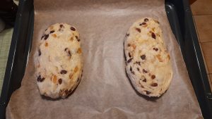 C’est en Autriche que je découvris ce gâteau à pâte levée typique de Noël aussi en Allemagne et en Alsace. On l’appelle d’ailleurs également Weihnachtsstollen. Au premier abord, je trouvais qu’il ne ressemblait pas à grand chose. Sa forme évoquerait toutefois l’Enfant Jésus emmailloté, ce qui est parfait pour Noël. On l’appelle ainsi également Christstollen. Je me méfie aussi toujours des gâteaux que l’on recouvre entièrement de sucre glace, même si l’évocation de la neige en cette période de fin d’année est plutôt sympa et qu’esthétiquement parlant, le Stollen est quand même plus joli recouvert de sucre glace. Toutefois, avec ses raisons secs et ses autres fruits secs et confits, il ne pouvait que me plaire. Ce n’est que l’an dernier que je me décidai à faire moi-même un Stollen, pensant que sa réalisation devait être difficile. Rien de difficile en réalité. Il faut juste avoir du temps devant soi ou plutôt rester dans les parages car la pâte doit reposer à plusieurs reprises. Vu l’effort demandé niveau temps, je décidai d’en faire deux et en ferai probablement quatre la prochaine fois. Le Stollen se conserve en effet très bien et peut constituer un très bon cadeau. Je les ai placé dans une boîte dans un placard de la cuisine et une semaine plus tard, je ne les trouvais même pas durcis.