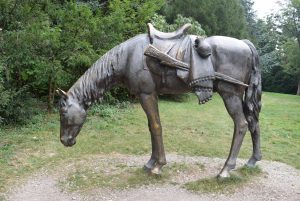 J’allais un instant l’oublier ! Peut-être comme ce Cosaque d’ailleurs. Son cheval ! Il broute gentiment quelques mètres derrière lui. Avec sa selle, sa cruche et son fusil sur le dos, il semble prêt à repartir. Vue la patine du bronze de sa selle à son étrier, nombreux ont dû être ceux voulant le faire galoper. Je dois vous avouer que cette idée m’a également traversé l’esprit 😉