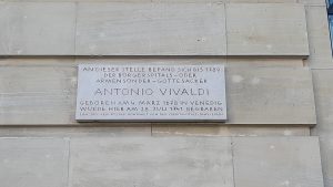Vivaldi fut inhumé dans le cimetière d’un hospice qui se situait là où se trouve la TU (université technique de Vienne) sur Karlsplatz, le Burgerspital. On trouve sur l’une de ses façades, celle située juste avant l’entrée dans la Karlsgasse une plaque en son souvenir. Cette plaque fait face à l’église Saint-Charles-Borromée (Karlskirche), église qui fut terminée quelques années seulement avant sa mort. On y donne désormais presque quotidiennement des concerts d’œuvres de Vivaldi, concerts qui font partie de ceux que des hommes déguisés en élégants du XVIIIe siècle essaient de nous vendre devant les lieux touristiques de Vienne.