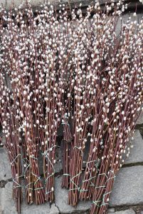Les Palmkätzchen sont des rameaux issus du saule marsault. On en trouve en effet partout à vendre avant Pâques, mais ne les appréciant guère (j’ai toujours envie d’en arracher les chatons, qui sont ses bourgeons), j’avais voulu faire dans l’originalité ou la résistance. Mon arbre de Pâques fut ainsi surnommé “mein fast Osterbaum”.