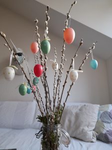 Cette année, je ne résistai pas à m’acheter un paquet d’œufs décoratifs à suspendre ! J’avais quelques tiges de roses bien rigides qui firent l’affaire. Très fière de ma petite réalisation, j’en montrai une photo à ma chef. Elle était très fière de moi mais me dit : « Amélise ! Il te faut des Palmkätzchen pour suspendre tes œufs ! » et je rétorquai quelque peu secouée par son interjection « Quoi !? On ne peut point faire cela avec n’importe quel branchage ! Et c’est quoi ces branches de bébés chats ? »