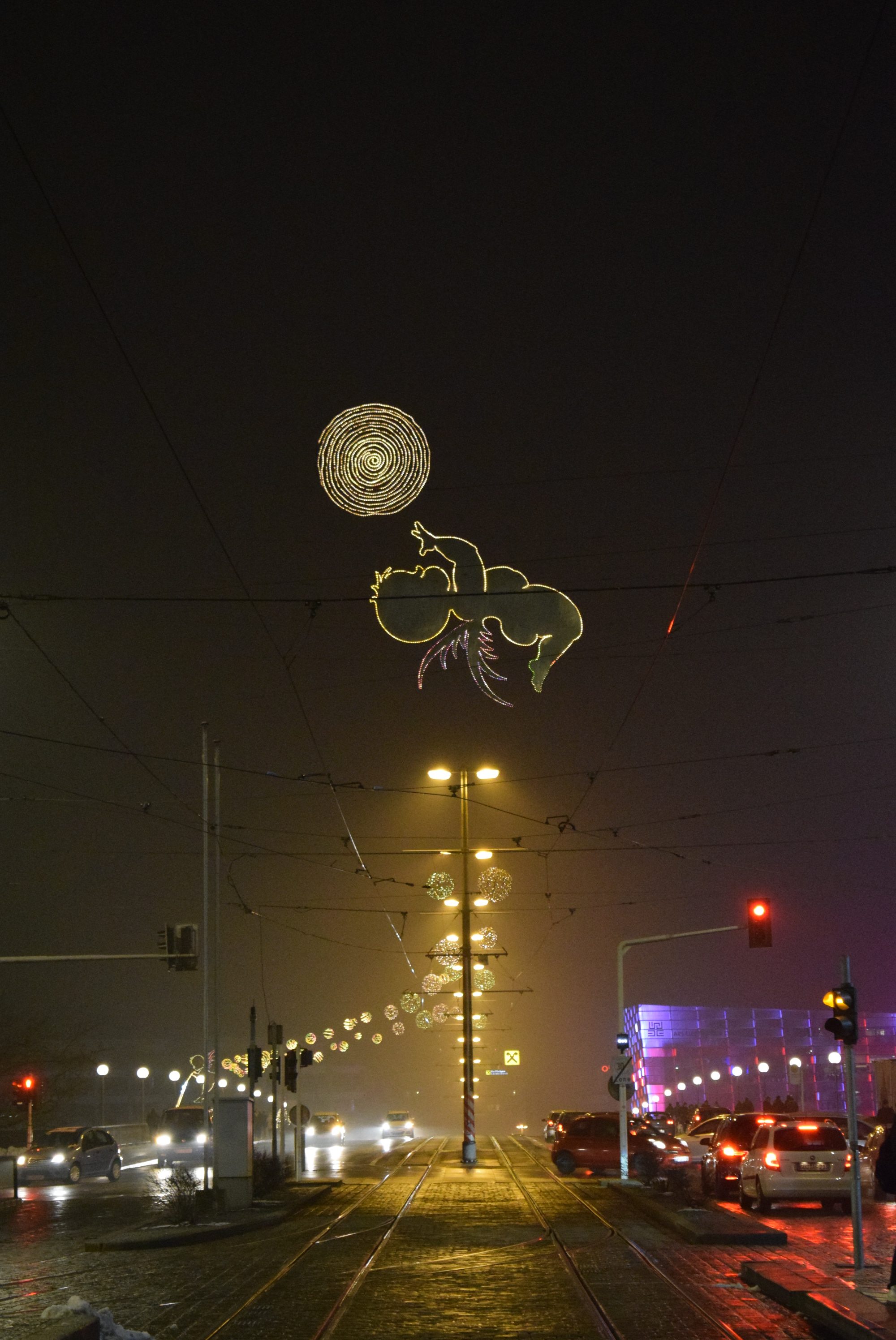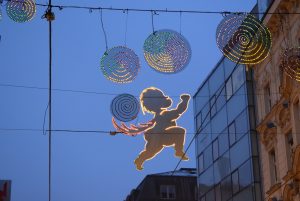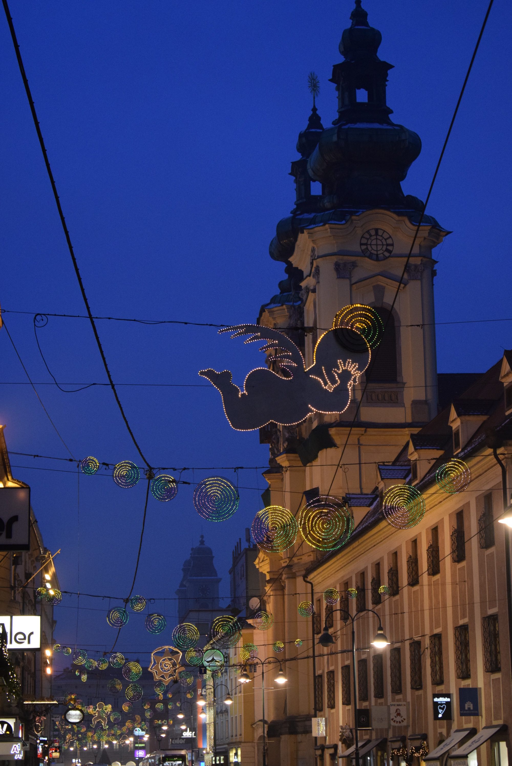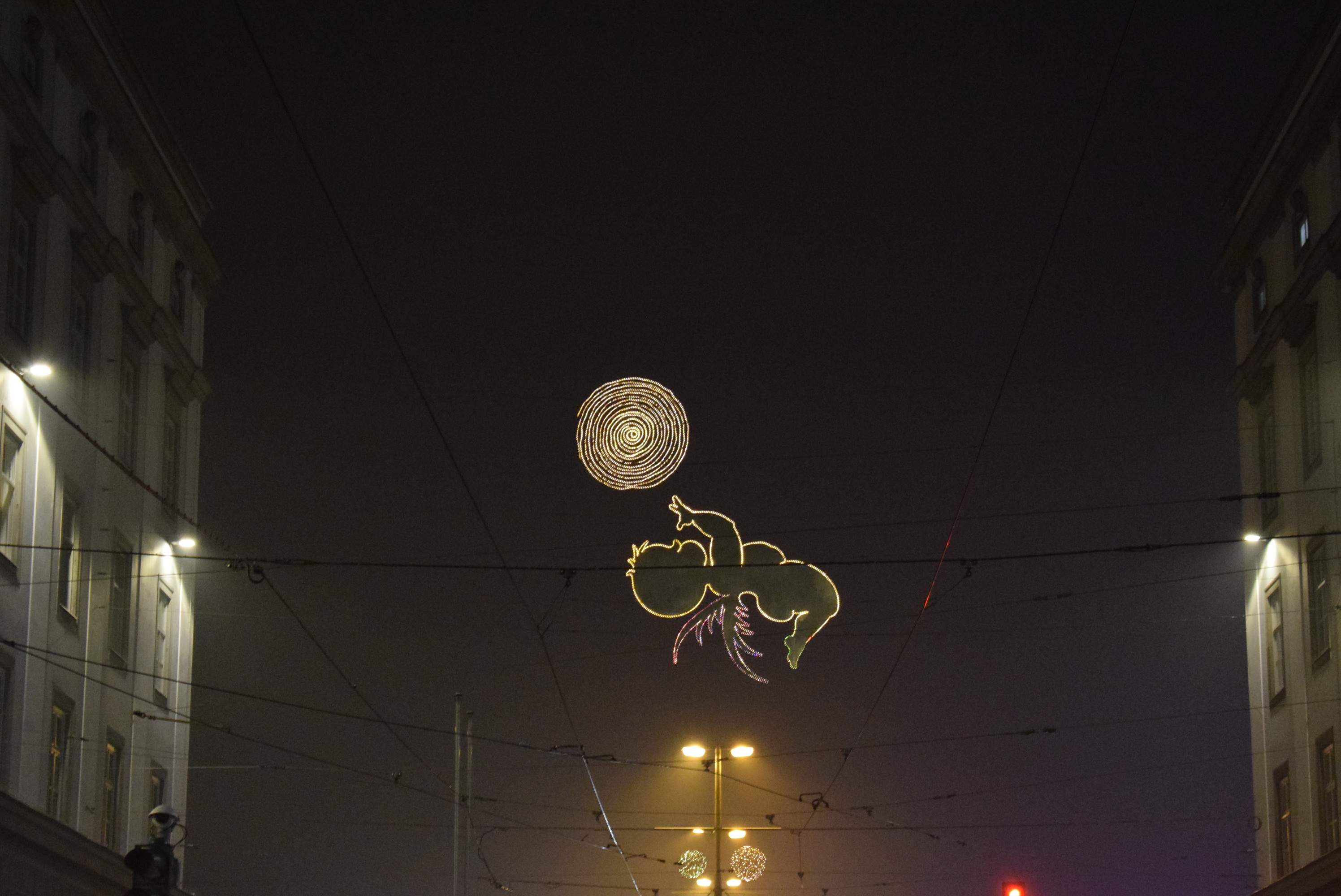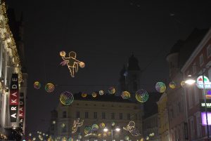 Il y a un an, je passai un week-end à Linz au moment des marchés de Noël et je me souviens avoir été marquée par les illuminations de Noël de la rue principale du centre-ville, la Landstraβe. De petits bonhommes enfantins très joufflus et dodus aux positions alambiquées se baladent au-dessus de nos têtes parmi des spirales colorées. Je me souviens en avoir été amusée, les trouvant d’ailleurs presque pornographiques. Le week-end dernier, je retournai à Linz et confirmai cette impression !