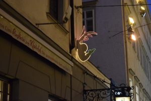 La conception de ce parcours lumineux de la Landstraβe est l’œuvre d’une master class en décors scéniques de l’université Mozarteum de Salzbourg. Les élèves de ce cours ont donc pris le ciel de cette rue pour scène, et figurez-vous que ces petits anges racontent même une histoire ! Cette histoire commence sur le pont des Nibelungen (Nibelungenbrücke). Là, un ange aspire l’écume du Danube pour en faire des bulles de savon, qui remontent ensuite la Landstraβe.