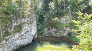 La randonnée commence le long de la Schwarza, que l’on suivra un certain temps. A certains endroits, l’eau de la rivière prend des tonalités turquoises magnifiques. Les cinq premiers kilomètres se déroulent en forêt dans l’étroite vallée où coule la Schwarza. C’est la seule partie de toute la randonnée qui comporte quelques dénivelés notables et s’effectue en partie sur de petits sentiers. Elle n’est pas difficile du tout. Les côtes ne sont pas très longues, mais il vaut mieux avoir des chaussures de randonnée.