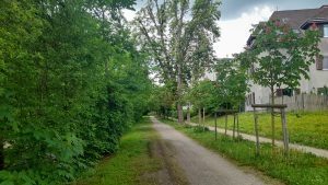 On arrive plus loin à une petite écluse qu’il nous faut franchir. On emprunte alors un escalier qui possède une goulotte pour les vélos (si vous êtes avec une remorque suivez donc le tracé de la Wientalradweg car en plus de l’escalier, le chemin qui suit est assez étroit). C’est à cet endroit que le Mauerbach se jette dans la Vienne. On continue sur un chemin et au croisement avec la Bahnstraße, on prend à droite puis à gauche très brièvement sur la route pour prendre la 1re à droite qui nous mène à la gare Wien Weidlingau, dernière gare de Vienne. On quitte alors la ville sans trop s’en rendre compte par un chemin plein de charme.