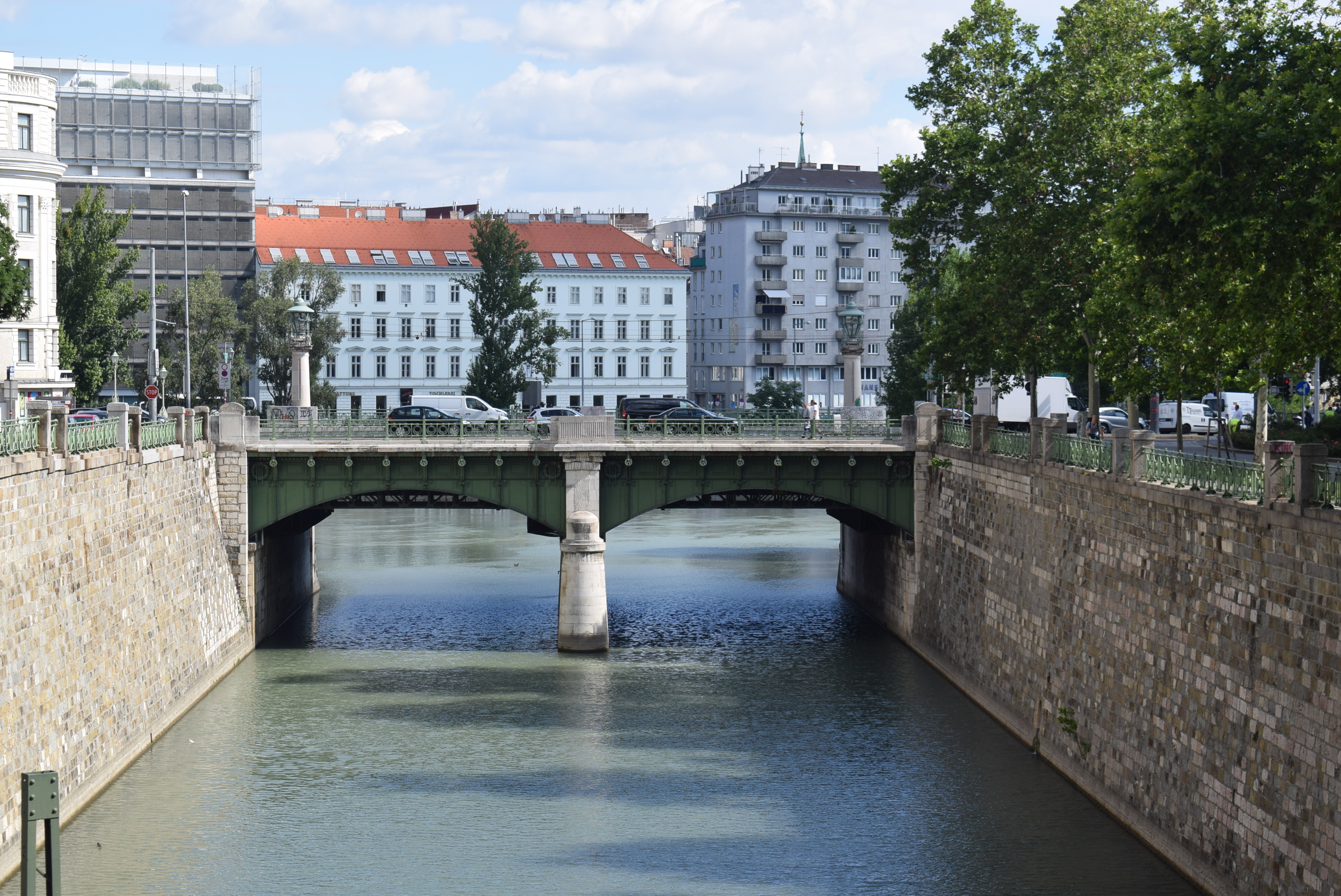 Sur près de 2 km, nous ne voyons ainsi plus son eau, mais nous suivons le tracé de la rivière. On passe ainsi devant le Konzerthaus, puis on longe Karlsplatz en passant au pied du Musikverein, toujours sans quitter les pistes cyclables. On passe ensuite devant la Sécession pour longer le Naschmarkt. Au niveau de la station de métro U4 Kettenbrückengasse, on s’engage sur le parking, au bout duquel la Vienne réapparaît. On prend alors sur la gauche pour suivre le cours d’eau depuis son autre rive. Au niveau de la station U4 Pilgramgasse, on emprunte le pont sur notre droite et on quitte un temps la Vienne en raison des travaux qui y ont lieu actuellement pour la création de la ligne de métro 5. On s’engage donc dans la Hofmühlgasse et on prend la 1re à gauche (Mollardgasse), puis la 2e à gauche (Anilingasse) et on traverse rivière et métro pour retrouver la voie verte longeant la Vienne.