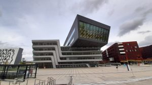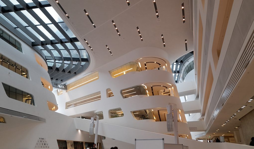 De l’extérieur je ne trouvais pas la bâtisse si spectaculaire. J’avais juste l’impression qu’un bloc foncé n’avait pas réussi à s’imbriquer sur le bloc clair du bâtiment. Je trouvais aussi les lignes droites un peu trop dures. Eh bien ces lignes droites, on les retrouve à l’intérieur où elles poursuivent leur chemin se transformant en lignes courbes et définissant les espaces, les ouvertures, les rampes, les escaliers… C’est vraiment très impressionnant. Lorsque l’on déambule dans le bâtiment, en se rendant aux étages supérieurs, on ressent l’architecture du bâtiment physiquement. Les mouvements créés par les escaliers, les rampes et les couloirs semblent vouloir nous aspirer et donnent presque le tournis. On ne peut pas pénétrer à l’intérieur des espaces de lecture réservés aux étudiants et des salles de l’administration, mais déambuler dans le forum est déjà une expérience que je qualifierais vraiment d’inoubliable, et qui nous permet vraiment de comprendre le travail et les préoccupations architecturales de Zaha Hadid. Ce qui était important pour elle, c’était le mouvement, et surtout que le corps se sente en mouvement dans ces intérieurs. On le comprend et surtout on le ressent véritablement sur place.